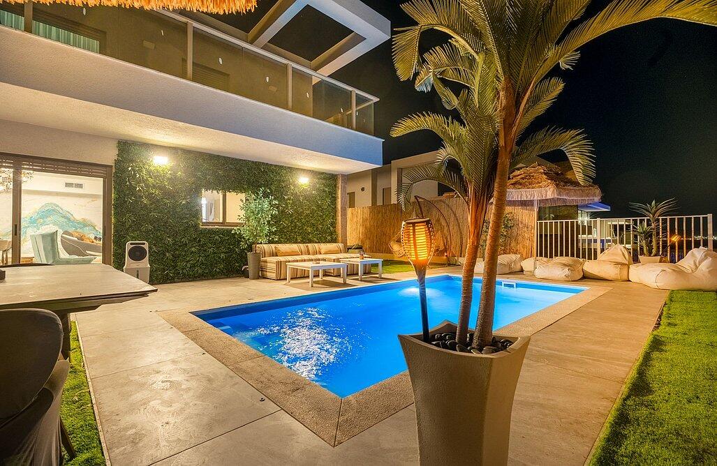 בית של אהבה – פנינת נופש חדשה באילת. וילה מרווחת ומפנקת בלב העיר הדרומית, ברחוב השלווה 12, במרחק פסיעה מהחוף של מוש. כאן תיהנו מפרטיות מלאה, פינוקים בלי סוף וחוויה יוקרתית. אז מה מחכה לכם: שטח פנימי וחיצוני – 125 מ"ר כל אחד כ- 4 חדרי שינה ו-2 חדרי רחצה, סלון מטבח ופינת אוכל, יציאה לחצר מרהיבה עם ג'קוזי ספא בריכה ועוד פינוקים. זה הזמן שלכם ליצירת זיכרונות מושלמים – הזמינו חופשה עכשיו.