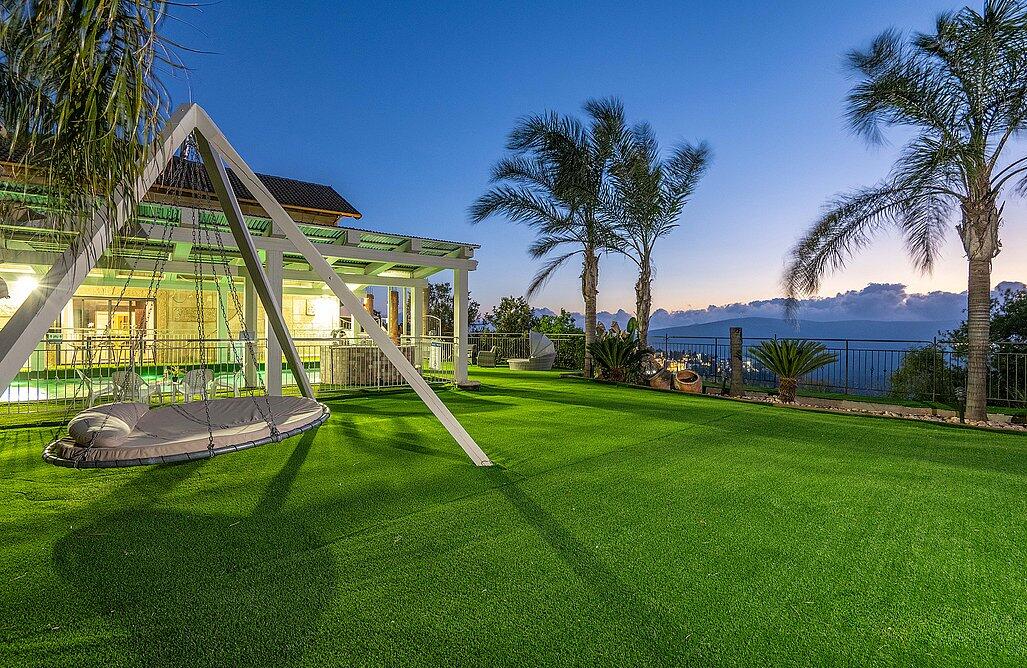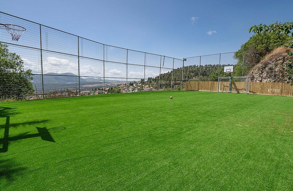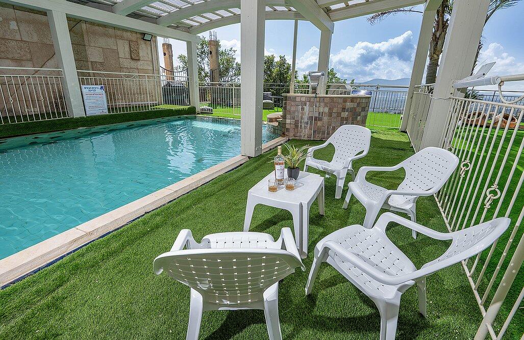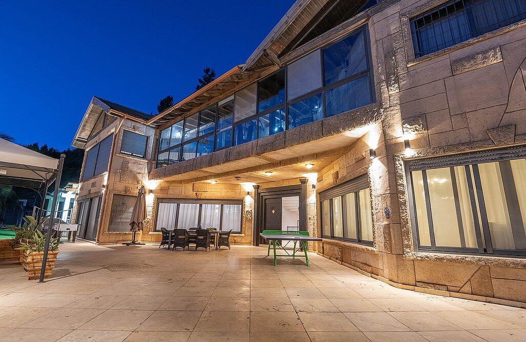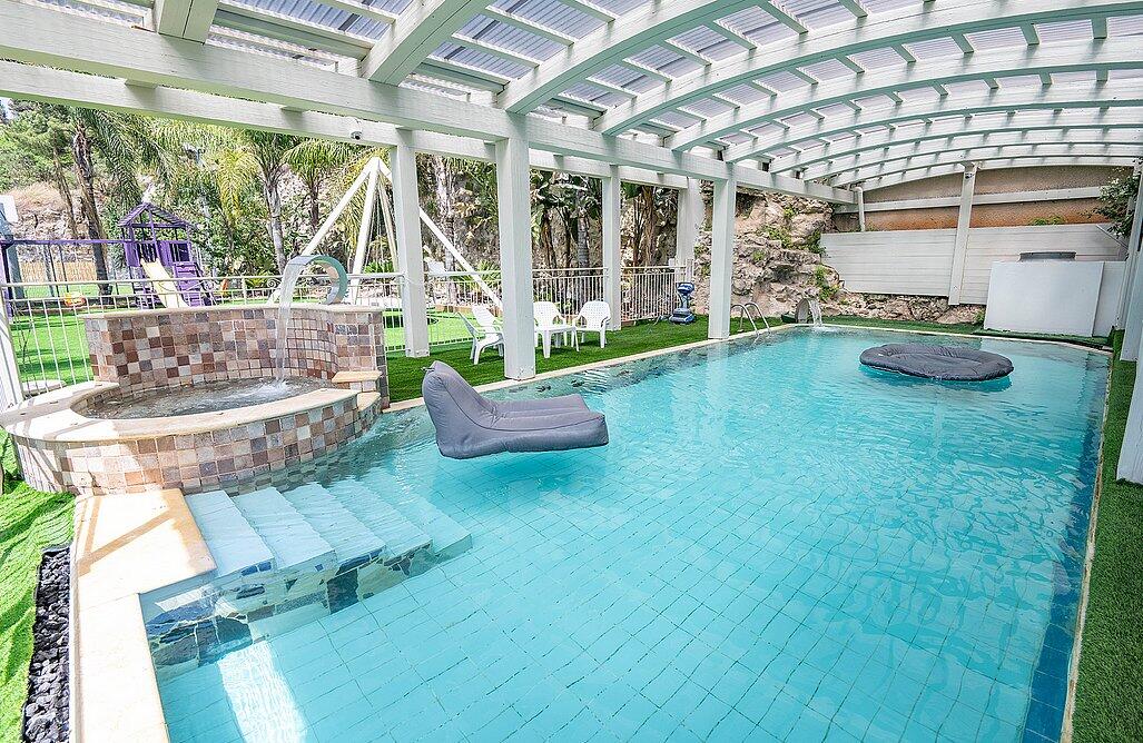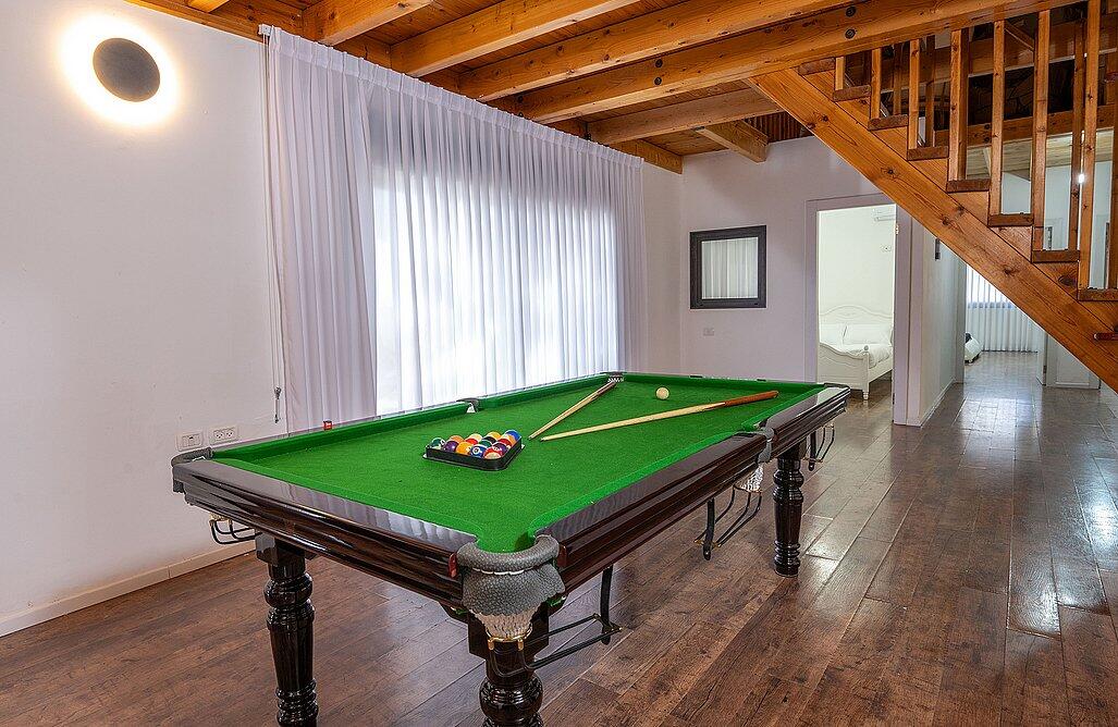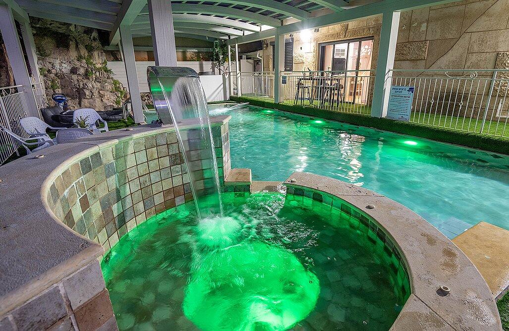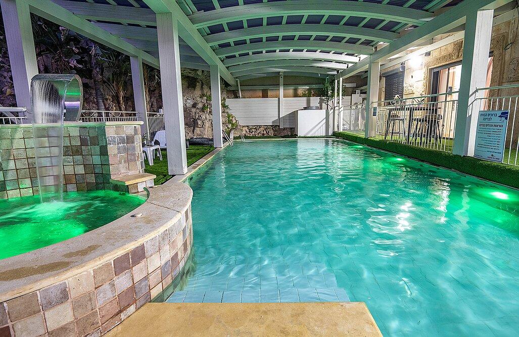 בריכת שחייה פרטית מחוממת מקורה עם מפל מים, ג'קוזי פתוח, מגרש כדורגל וכדורסל, פינת משחקים לילדים ושולחנות ביליארד – חו"ל בצפת.