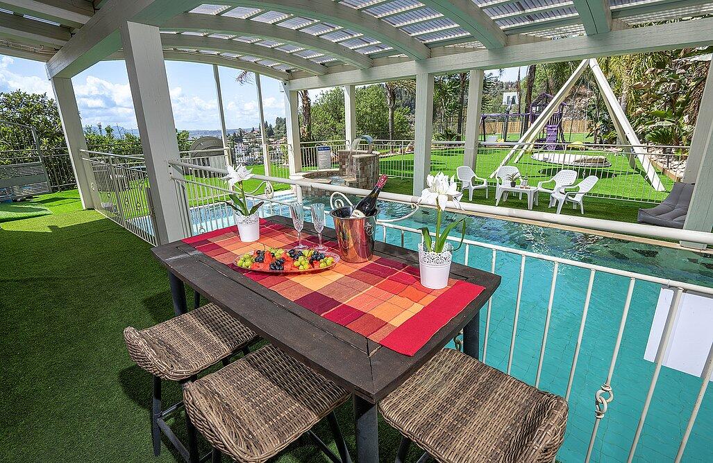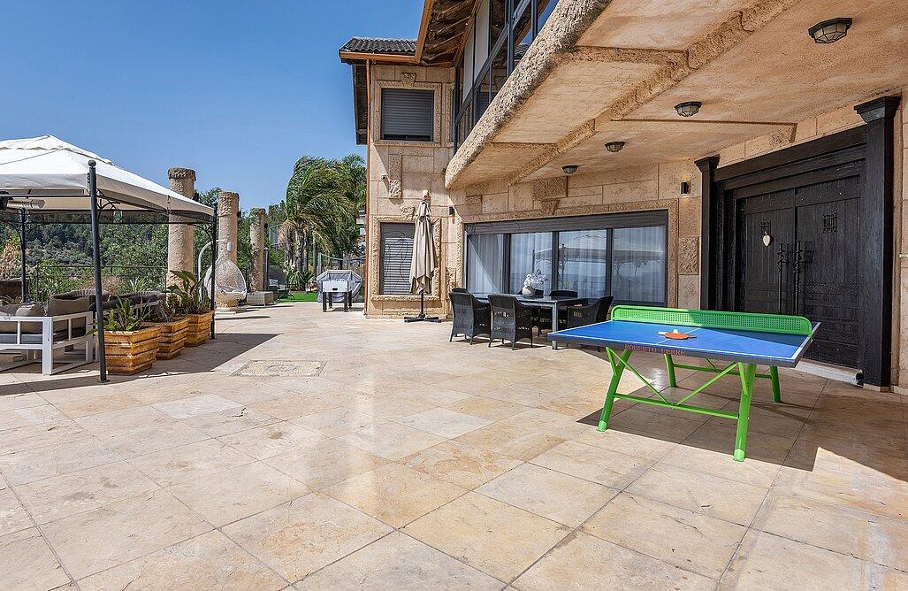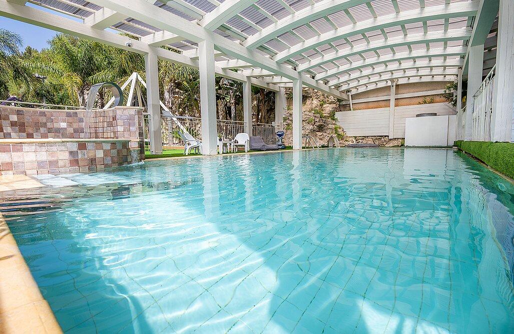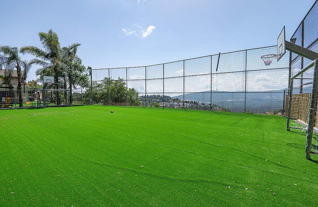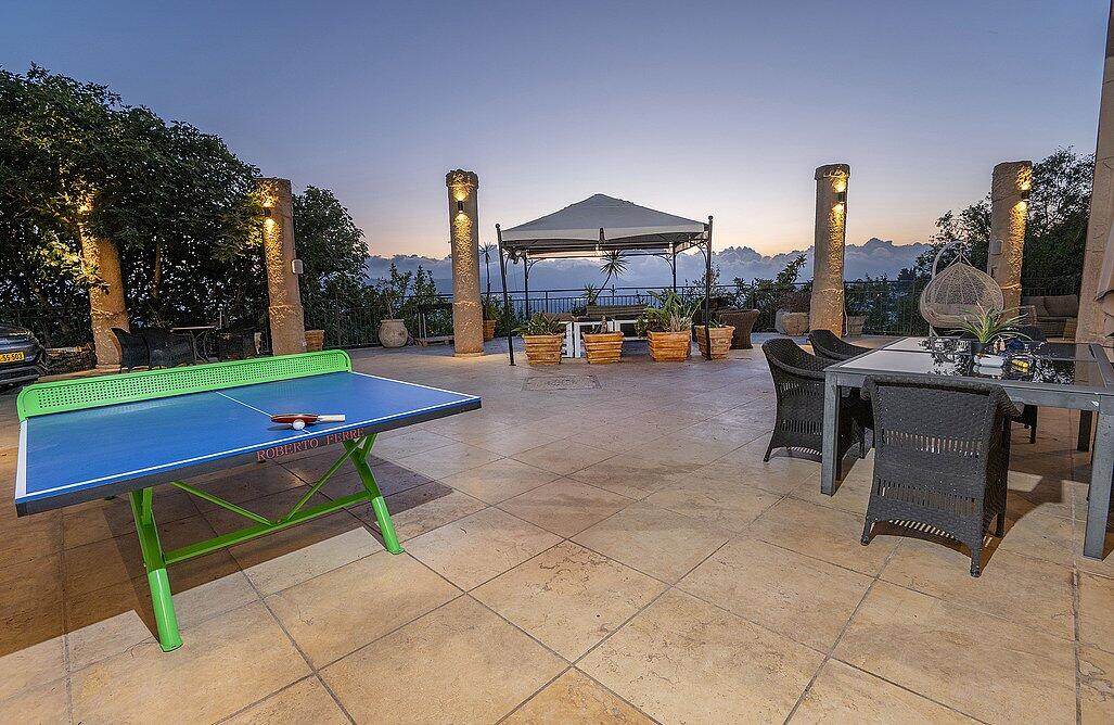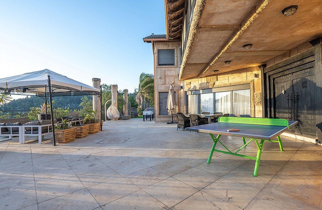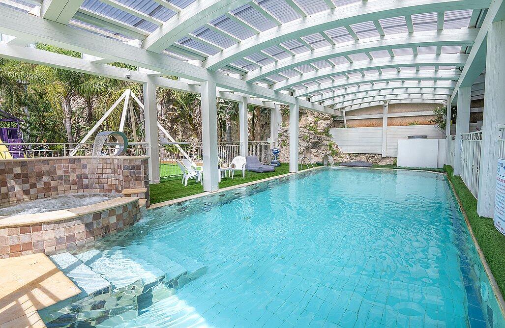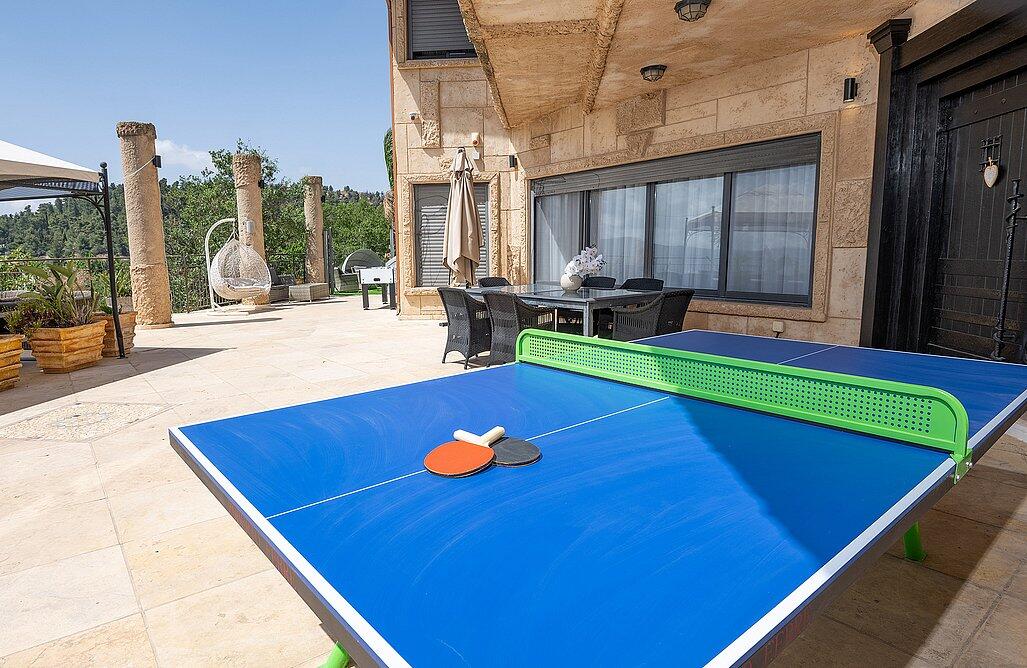 בריכת שחייה פרטית מחוממת מקורה עם מפל מים, ג'קוזי פתוח, מגרש כדורגל וכדורסל, פינת משחקים לילדים ושולחנות ביליארד – חו"ל בצפת.