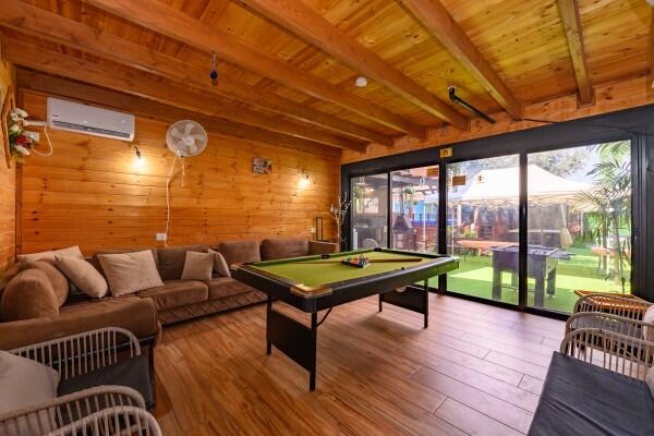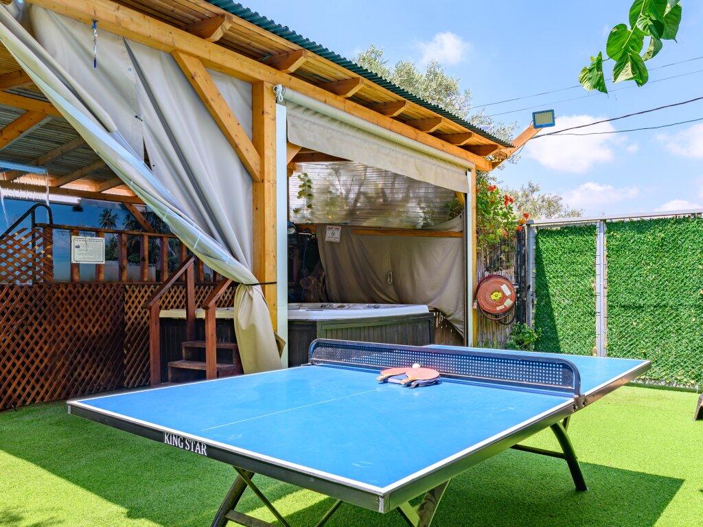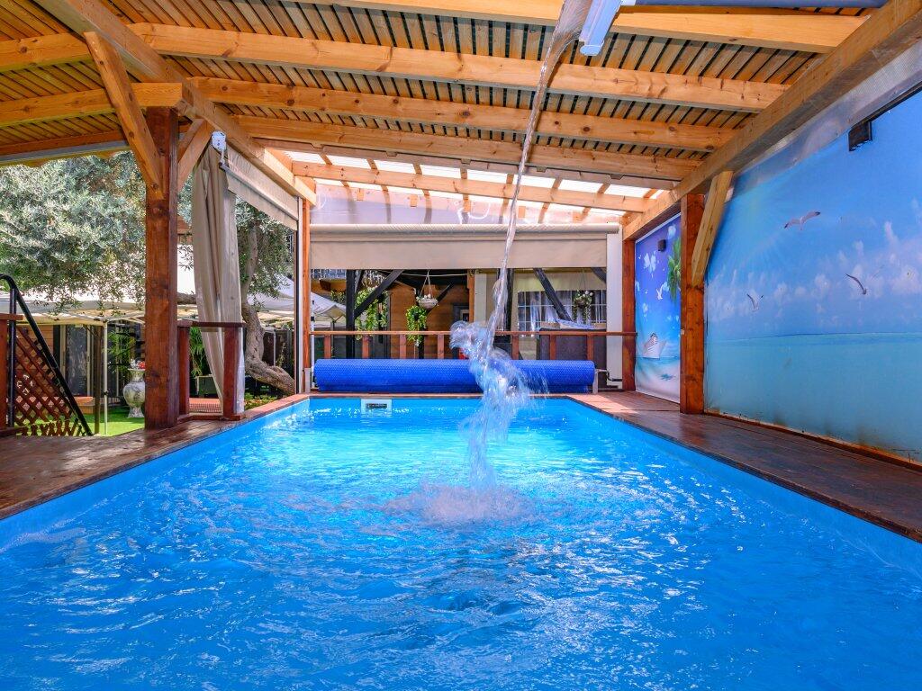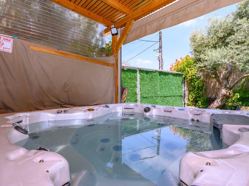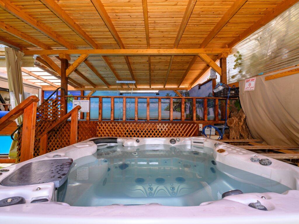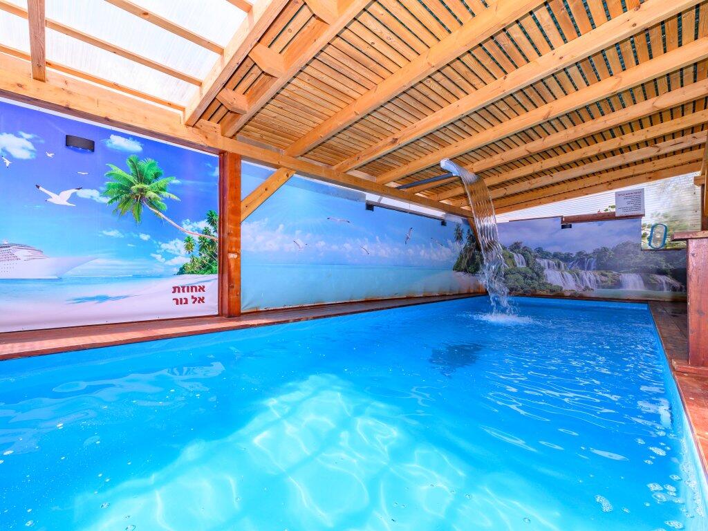 מתחם חיצוני משגע עם בריכת שחייה מחוממת ומקורה בחורף, ג'קוזי ספא ומלא משחקים לכל המשפחה.