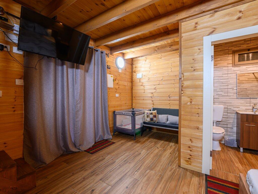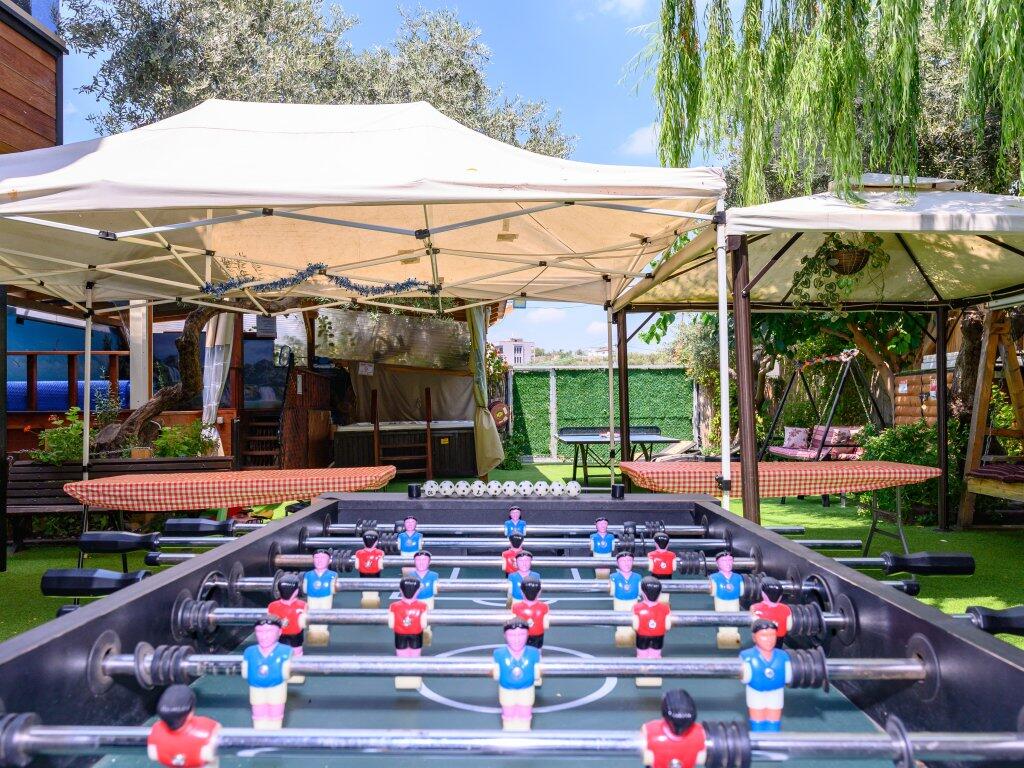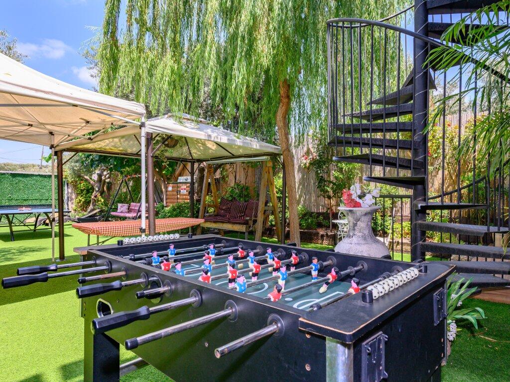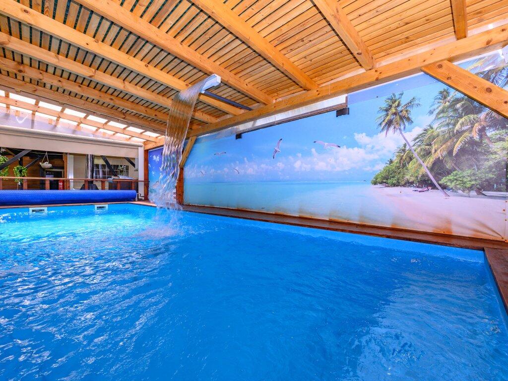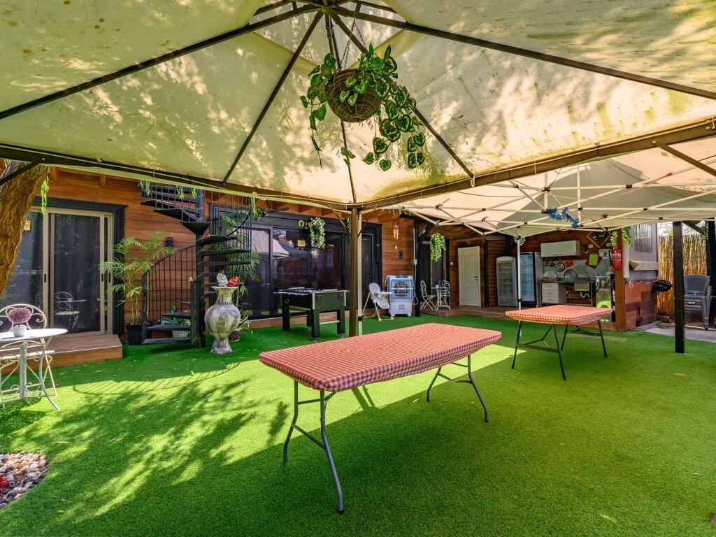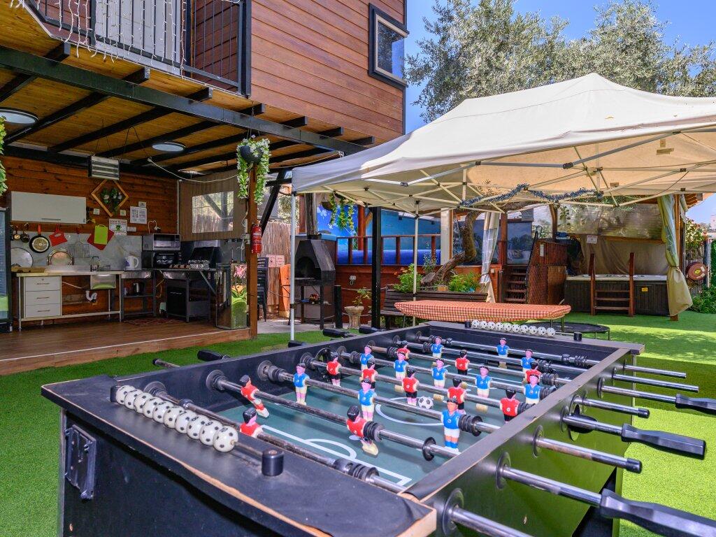 מתחם חיצוני משגע עם בריכת שחייה מחוממת ומקורה בחורף, ג'קוזי ספא ומלא משחקים לכל המשפחה.