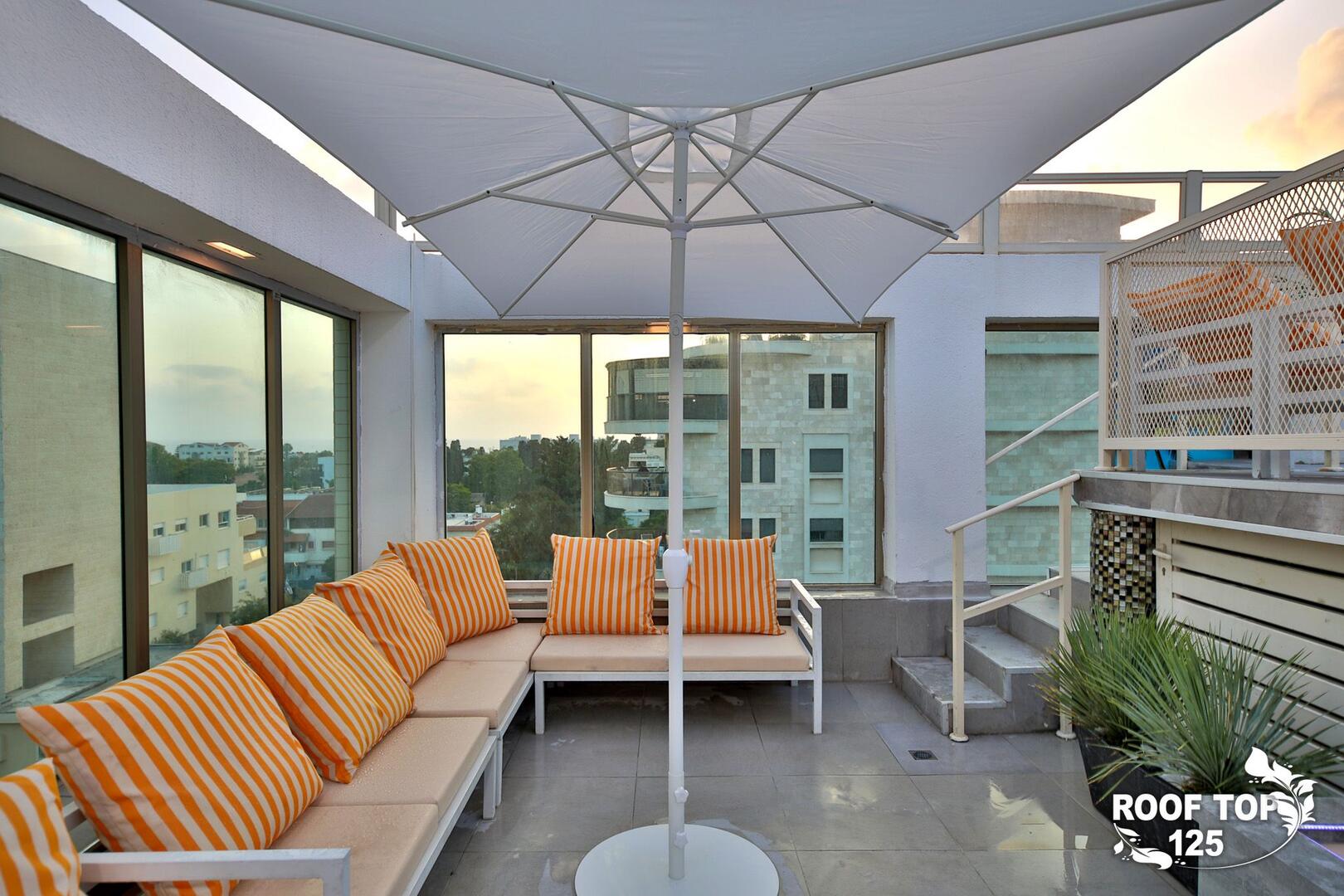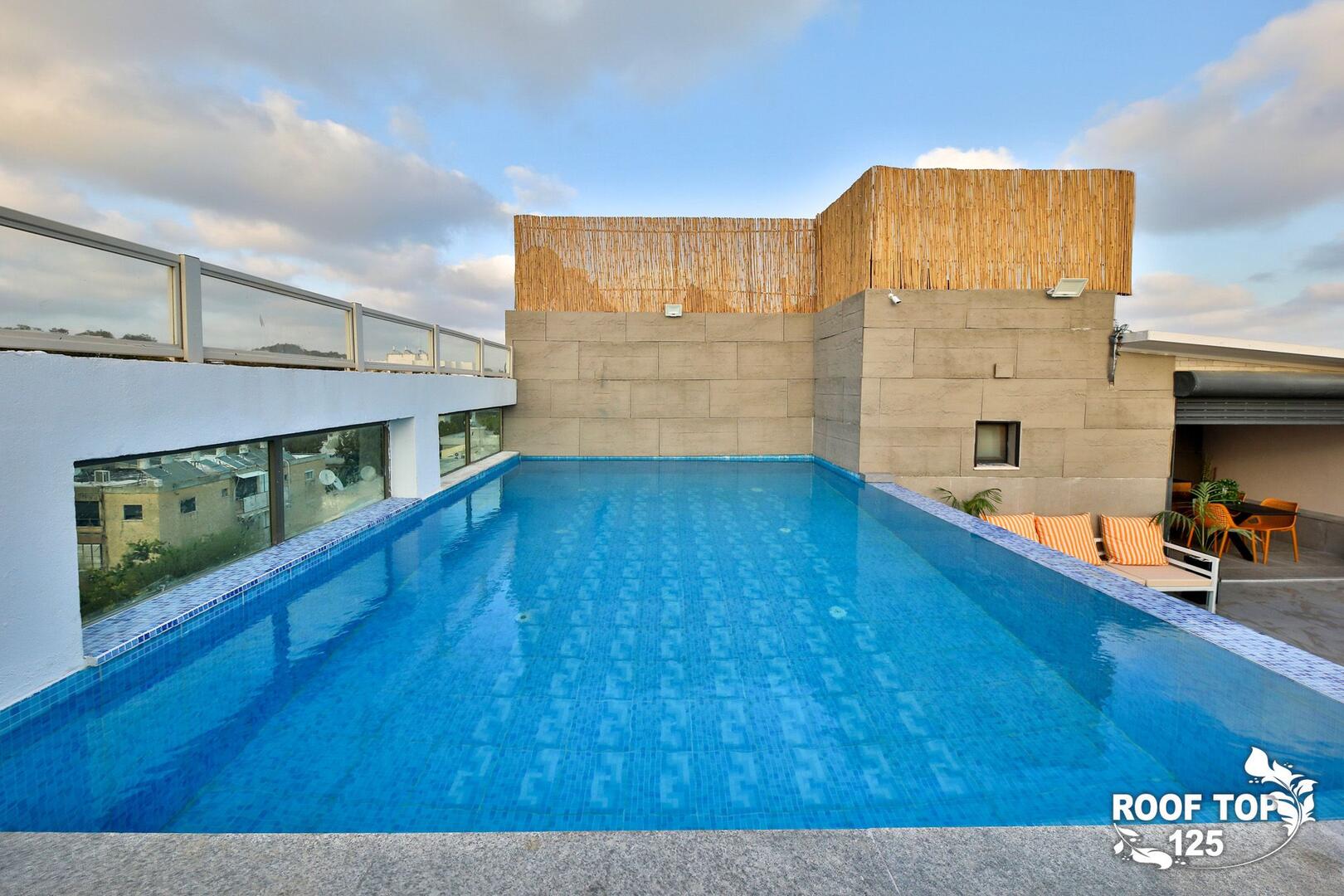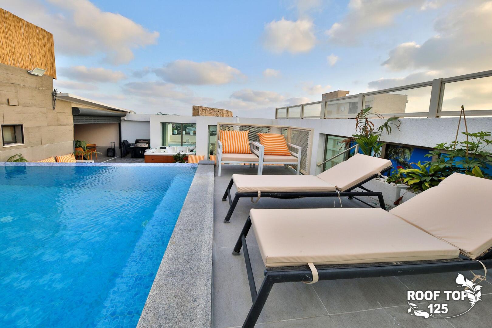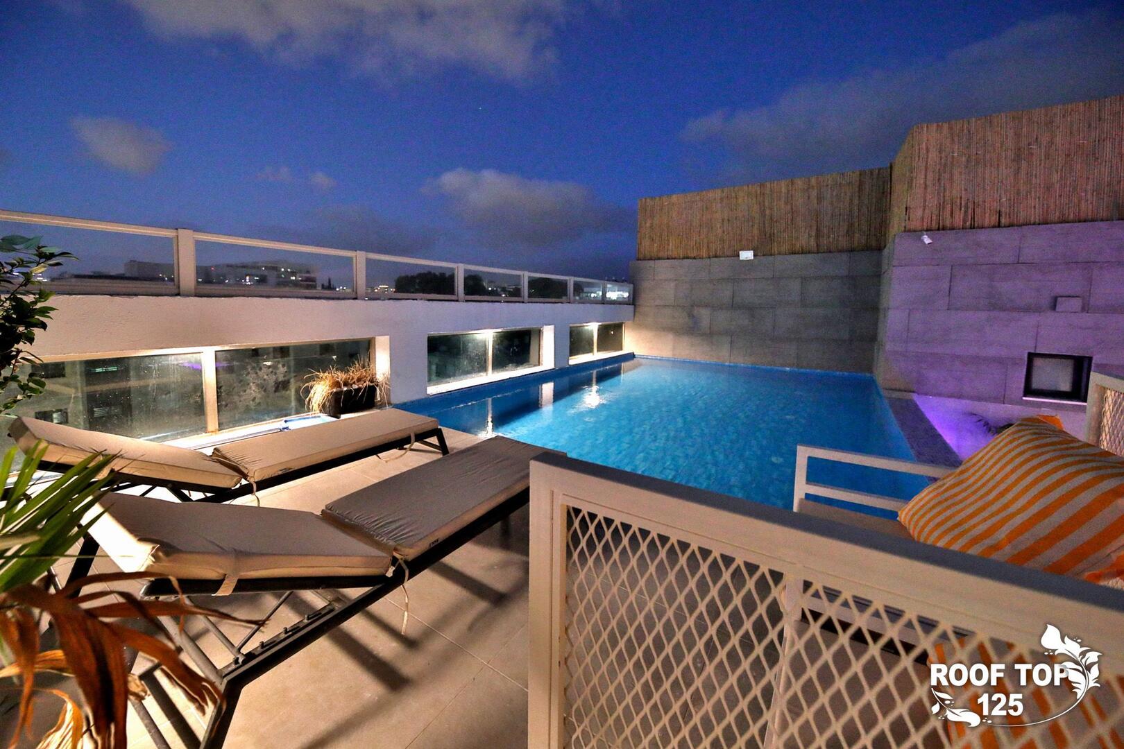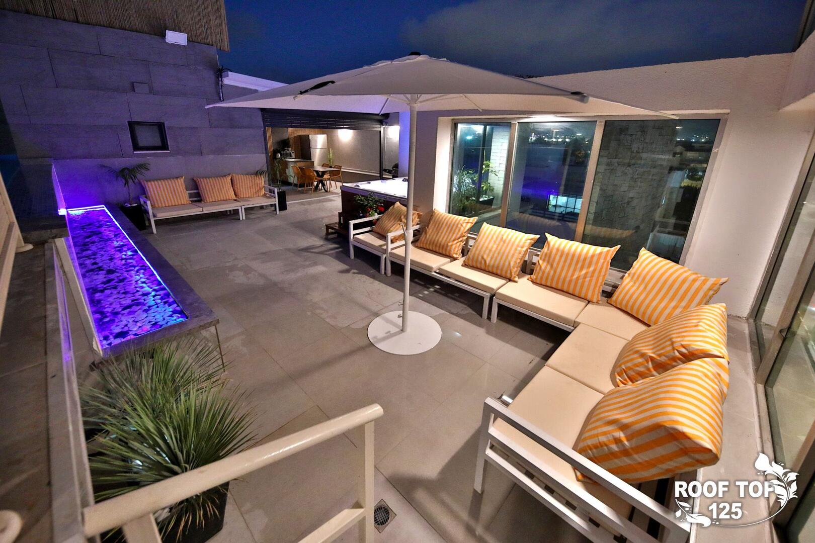 רוף טופ 125 מציע חווית נופש בלתי רגילה במיקום מושלם בנהריה, עם גישה ישירה לנוף עוצר נשימה של העיר. המתחם נמצא בגג בניין ומציע מקום נוח ומפנק הכולל סלון מרווח ומעוצב עם פינת אוכל, מטבח מאובזר קומפלט, ובחוץ – בריכת אינפיניטי מדהימה, ג'קוזי ספא לוהט ומגוון פינות ישיבה נוחות. עם חמישה חדרי שינה, המתחם מציע אירוח לזוגות, משפחות וקבוצות, ומאפשר לינה עד 16 אורחים. אם אתם מחפשים מקום להתארח בו במסגרת אירוע סולידי, רוף טופ 125 מציע את המענה המושלם. תוכלו גם להזמין שף פרטי, מגשי סושי ולקבל שירות צמוד 24 שעות ביממה, כך שתקבלו את כל מה שאתם צריכים לנפוש בצורה הטובה ביותר.
