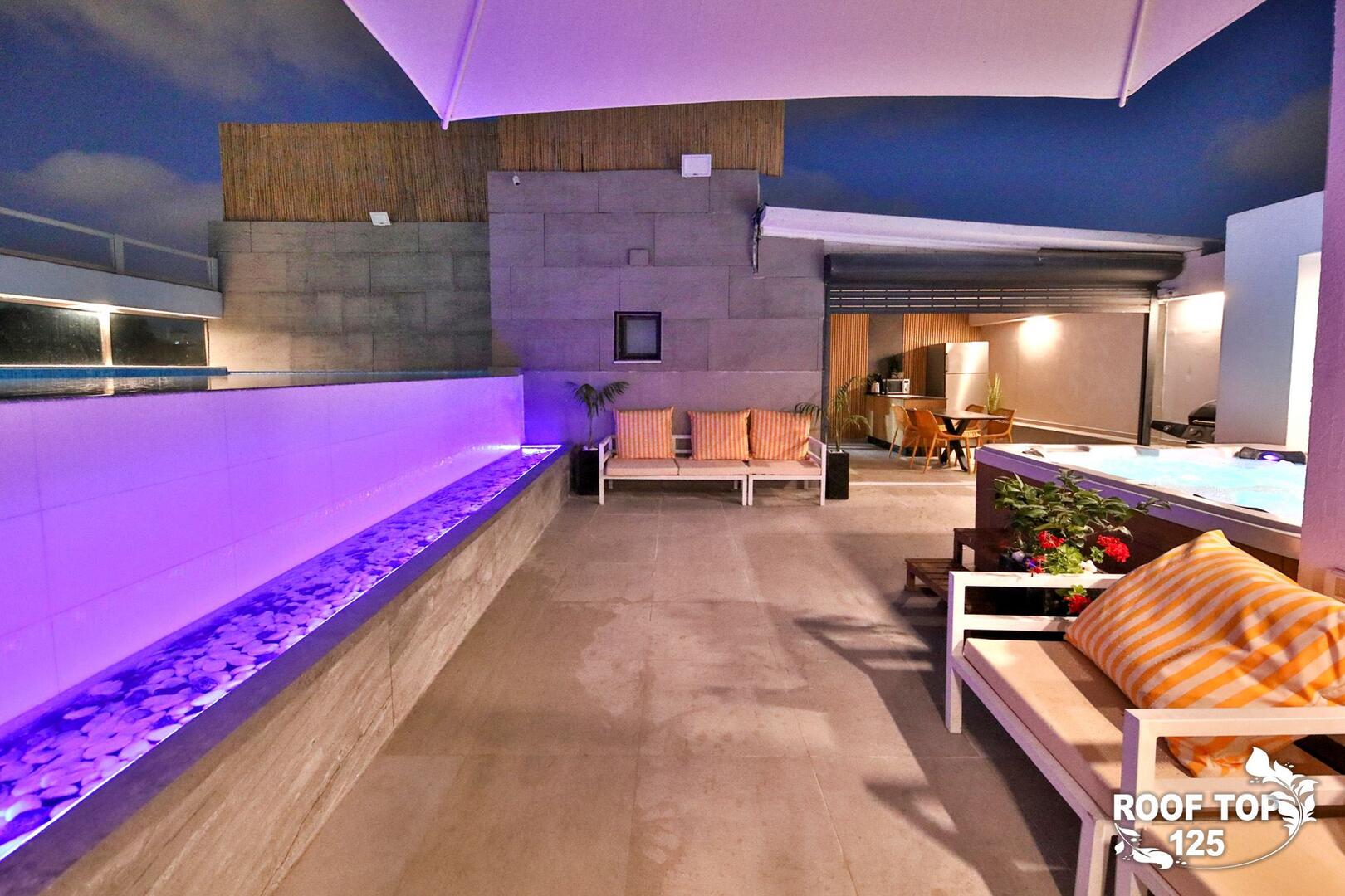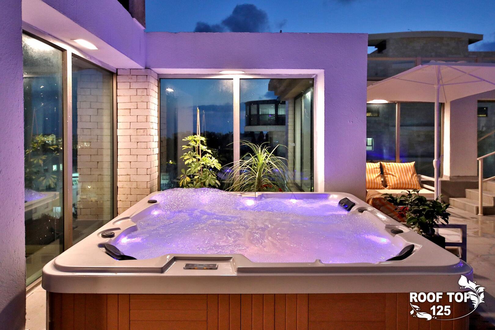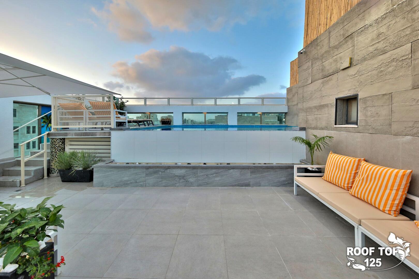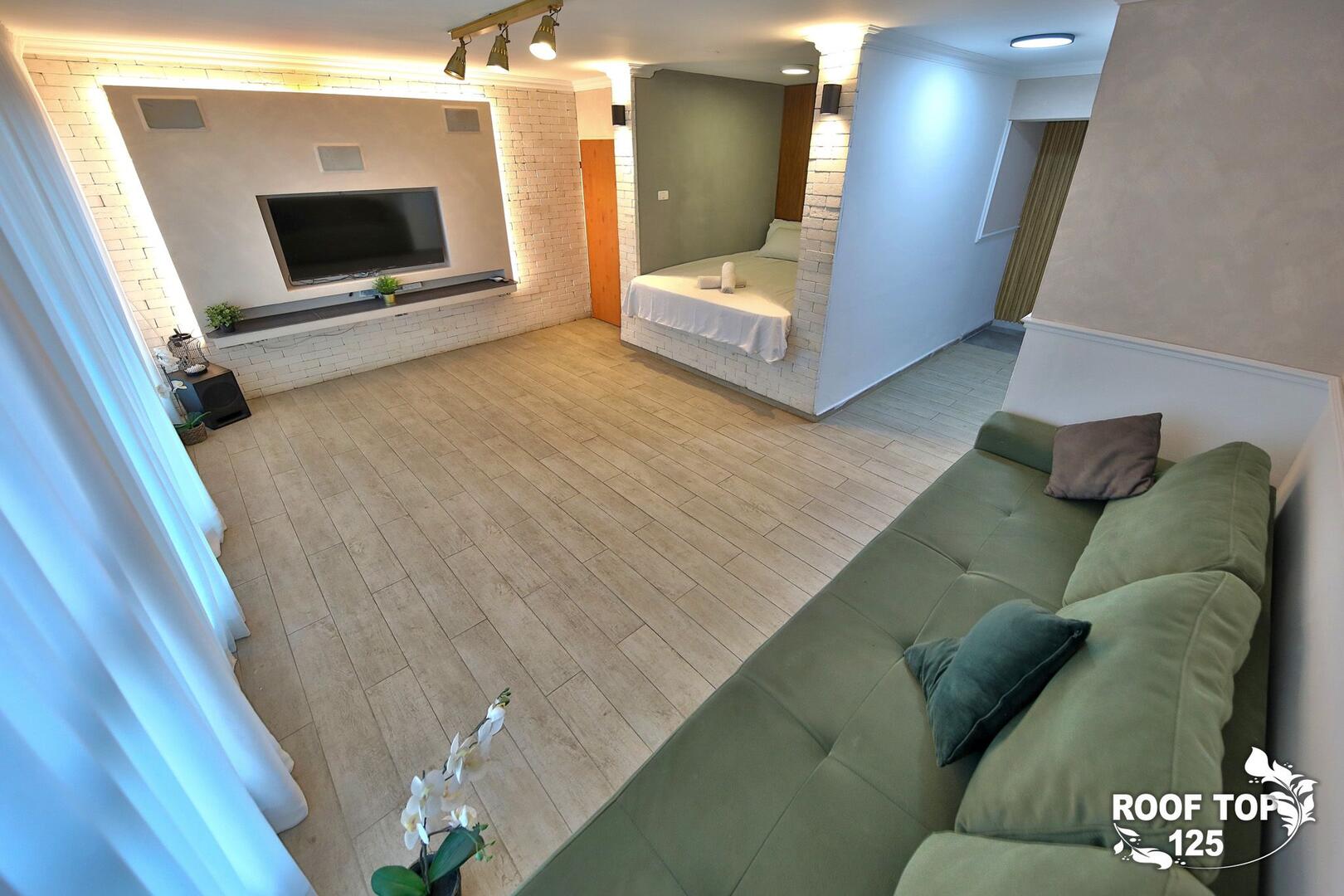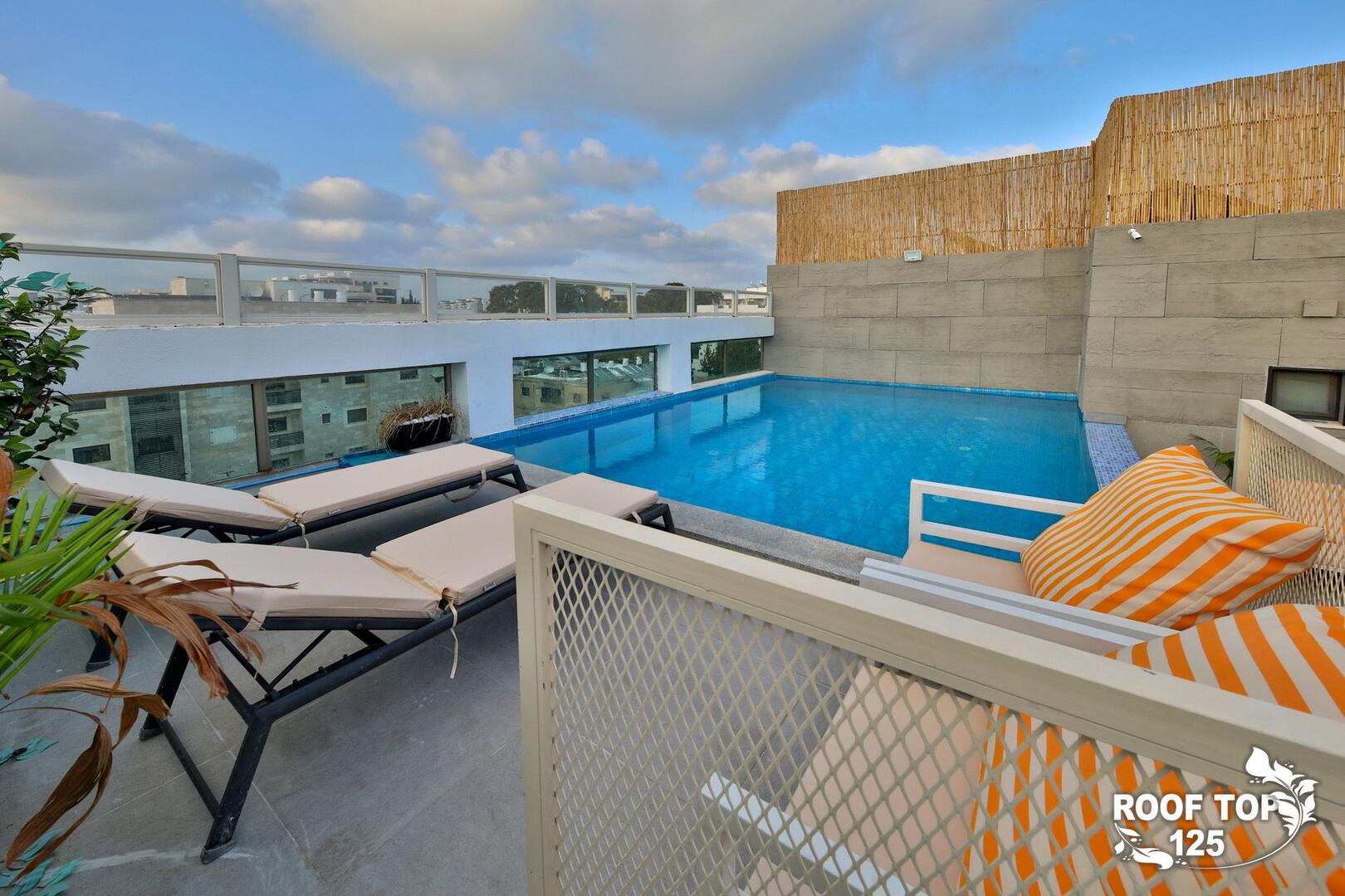 רוף טופ 125 מציע חווית נופש בלתי רגילה במיקום מושלם בנהריה, עם גישה ישירה לנוף עוצר נשימה של העיר. המתחם נמצא בגג בניין ומציע מקום נוח ומפנק הכולל סלון מרווח ומעוצב עם פינת אוכל, מטבח מאובזר קומפלט, ובחוץ – בריכת אינפיניטי מדהימה, ג'קוזי ספא לוהט ומגוון פינות ישיבה נוחות. עם חמישה חדרי שינה, המתחם מציע אירוח לזוגות, משפחות וקבוצות, ומאפשר לינה עד 16 אורחים. אם אתם מחפשים מקום להתארח בו במסגרת אירוע סולידי, רוף טופ 125 מציע את המענה המושלם. תוכלו גם להזמין שף פרטי, מגשי סושי ולקבל שירות צמוד 24 שעות ביממה, כך שתקבלו את כל מה שאתם צריכים לנפוש בצורה הטובה ביותר.
