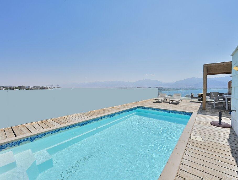 לוילה קיימת קומת גג עם בריכה צלולה עם הנוף המושלם של הים וחופשי הרחצה