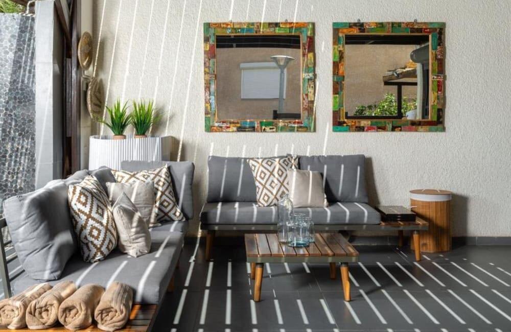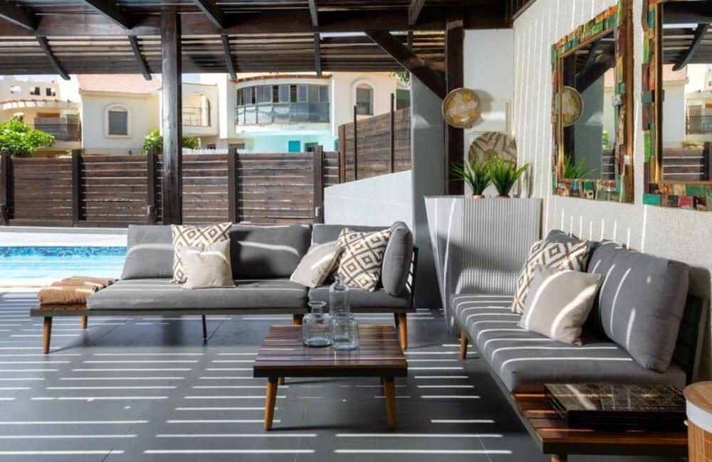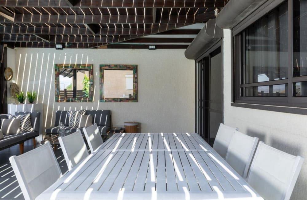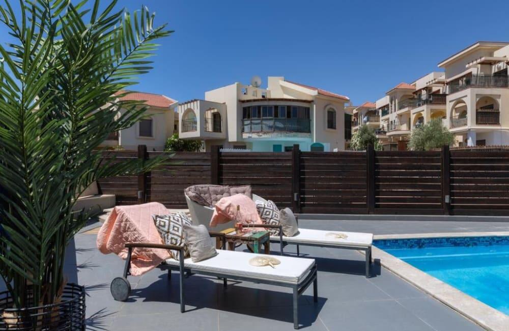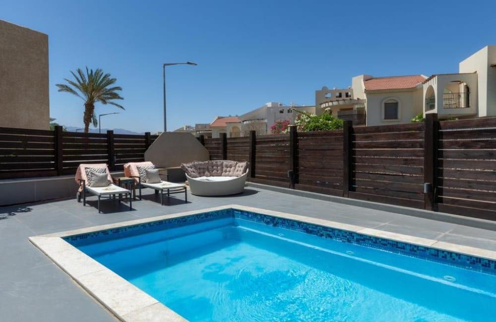 החצר הפרטית כוללת בריכה מחוממת, אזורי שיזוף ופינת ברביקיו מושלמת לאירוח.