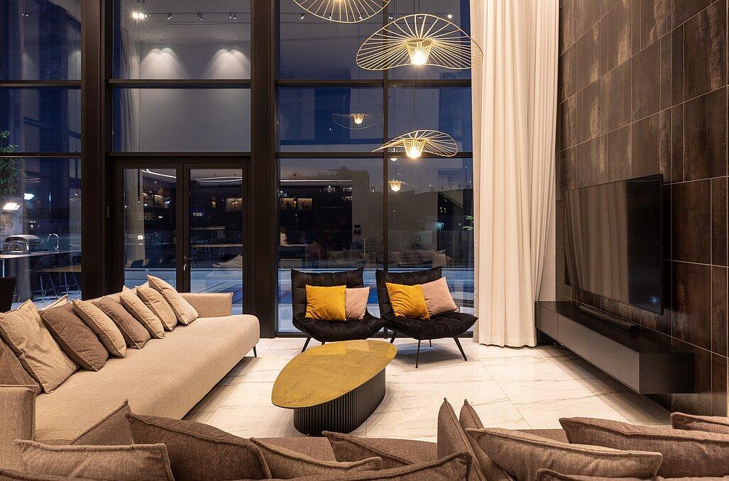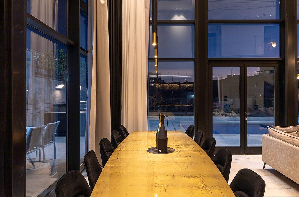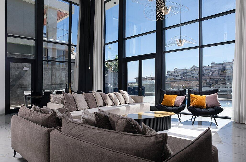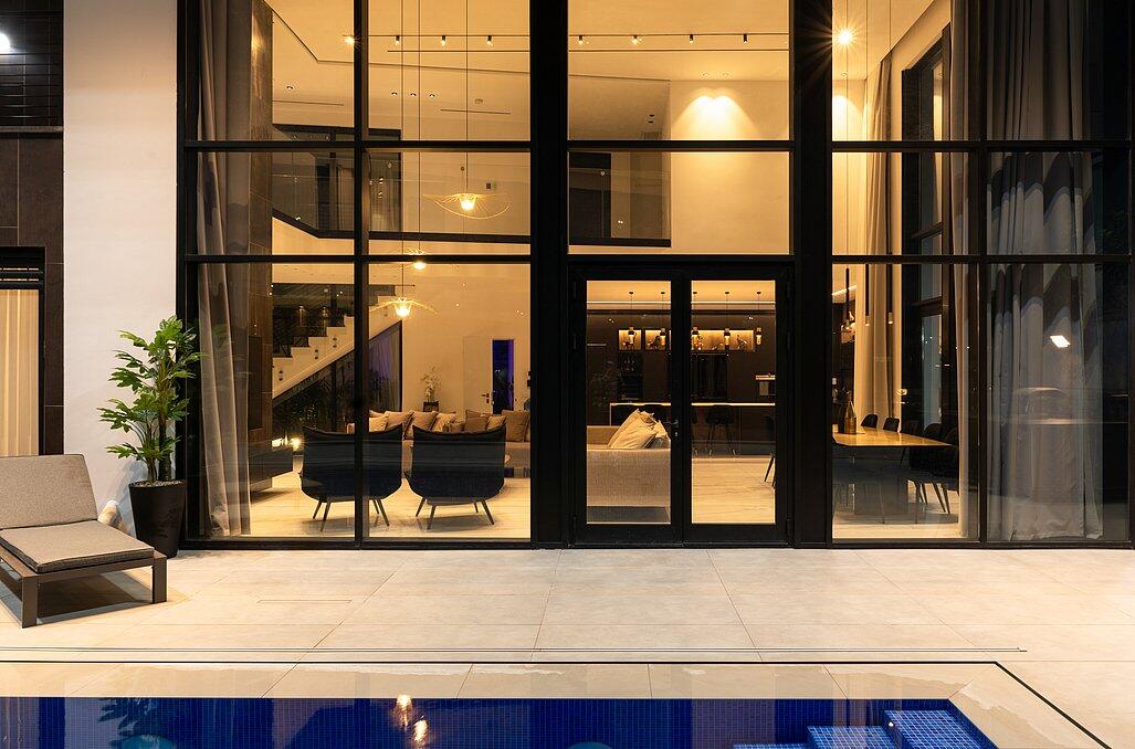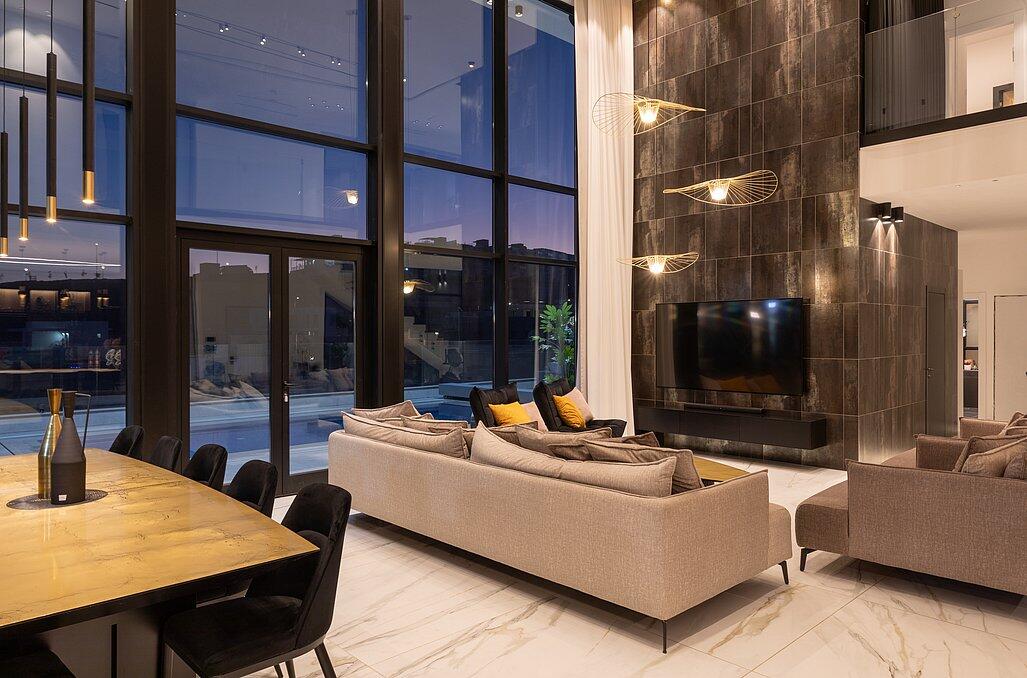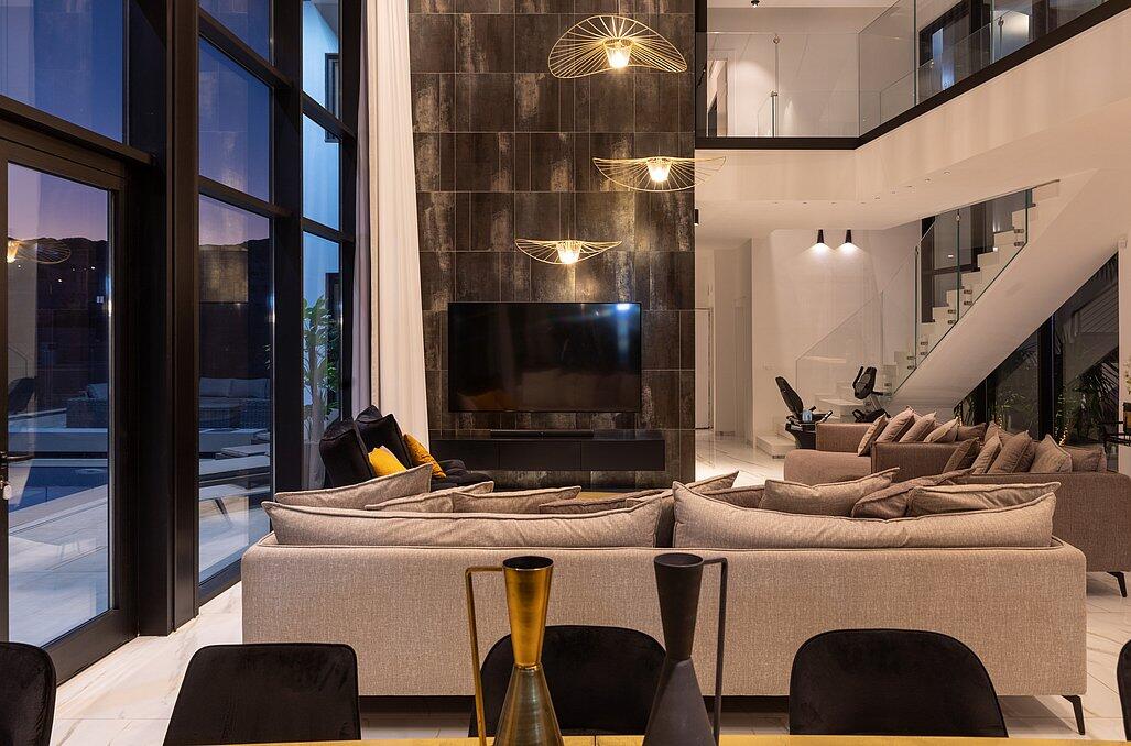 בעלת עיצוב מודרני, קיר מסך ענק המתפרס לאורך כל הוילה עם המוצרים הטובים בשוק.