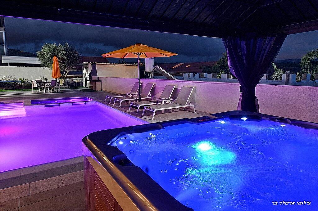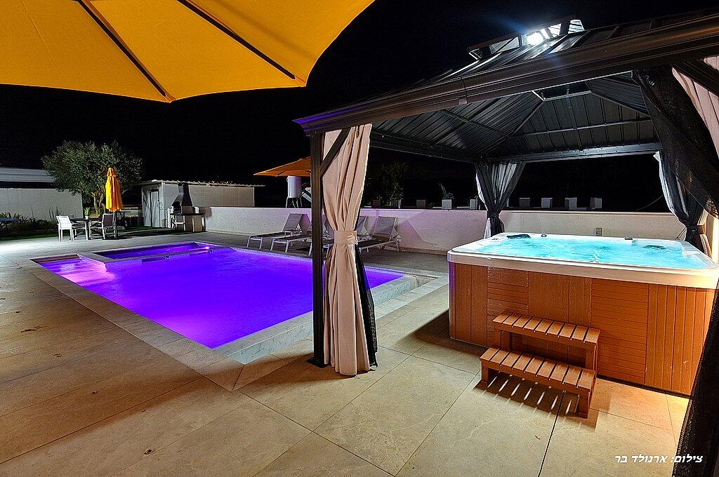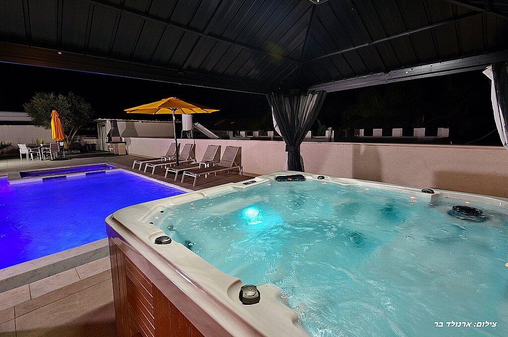 כדאי לדעת: בנוסף לוילה, ישנה אפשרות להשכיר עוד 2 סוויטות יוקרתיות. כל סוויטה כוללת מיטה זוגית, ג'קוזי מפנק, סלון יוקרתי, טלוויזיה 32 אינץ', מטבחון מאובזר, מיזוג אוויר, חדר רחצה ומרפסת פרטית עם מערכת ישיבה. סוויטות אלו כוללות גם בריכה פרטית מחוממת ומקורה. אם תבחרו להשכיר את הוילה והסוויטות יחד, תהנו ממתחם ענק עם 8 חדרים ו-3 בריכות שחייה – מקום אידיאלי לנופש קבוצתי או משפחתי.