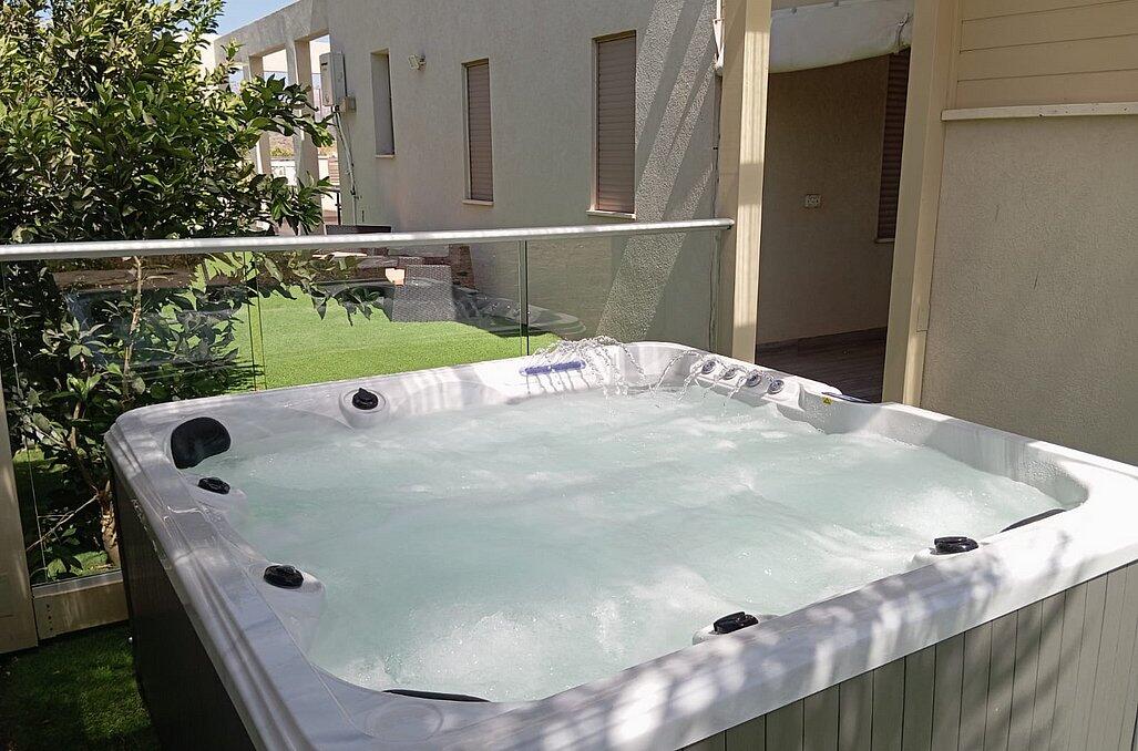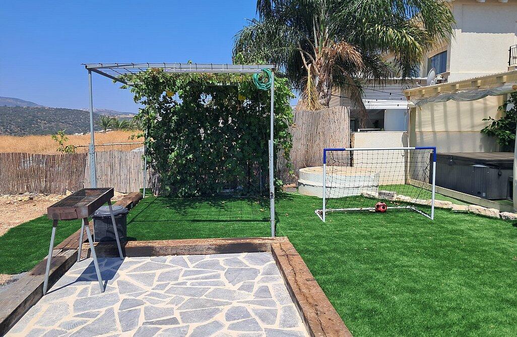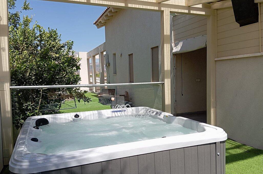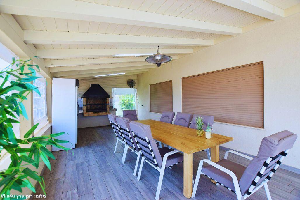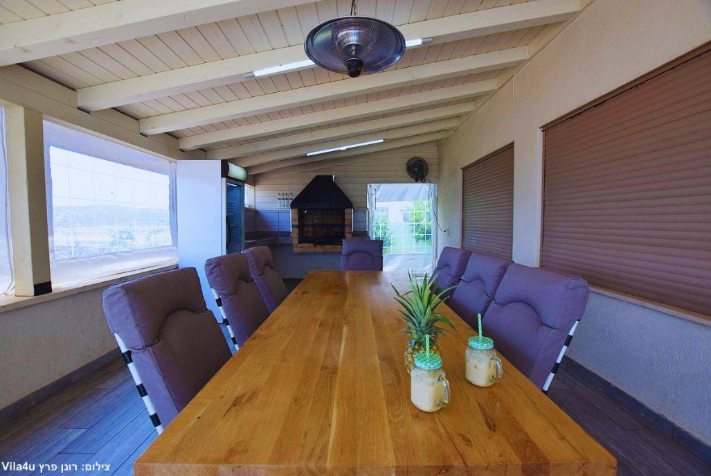 והשוס מתחם חיצוני מדהים הפונה לנופי הצפון הירוקים עם בריכה בנויה מחוממת ומקורה, ג'קוזי ספא, עמדת מנגל בנויה ומקורה עם מטבח חיצוני ותאורת אווירה נעימה ומרגיעה
