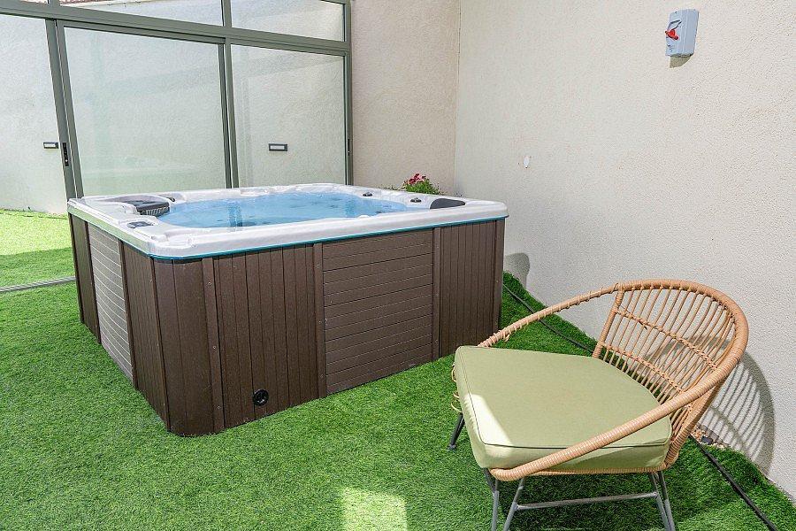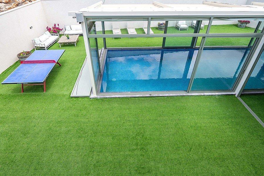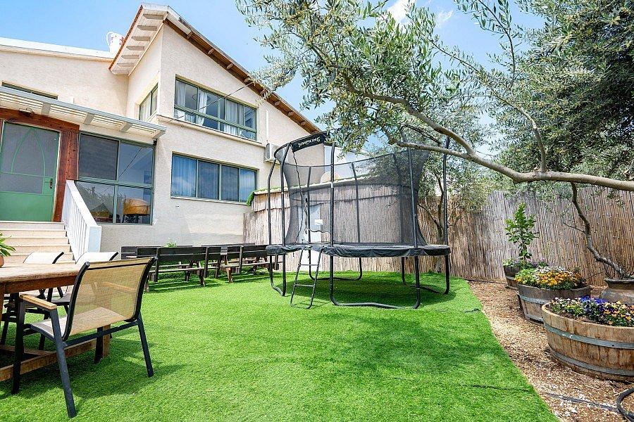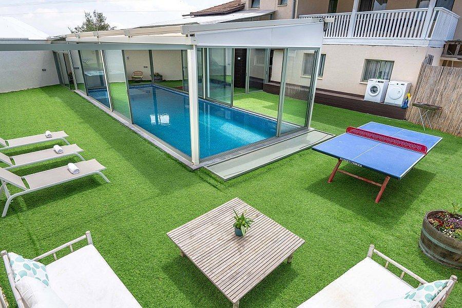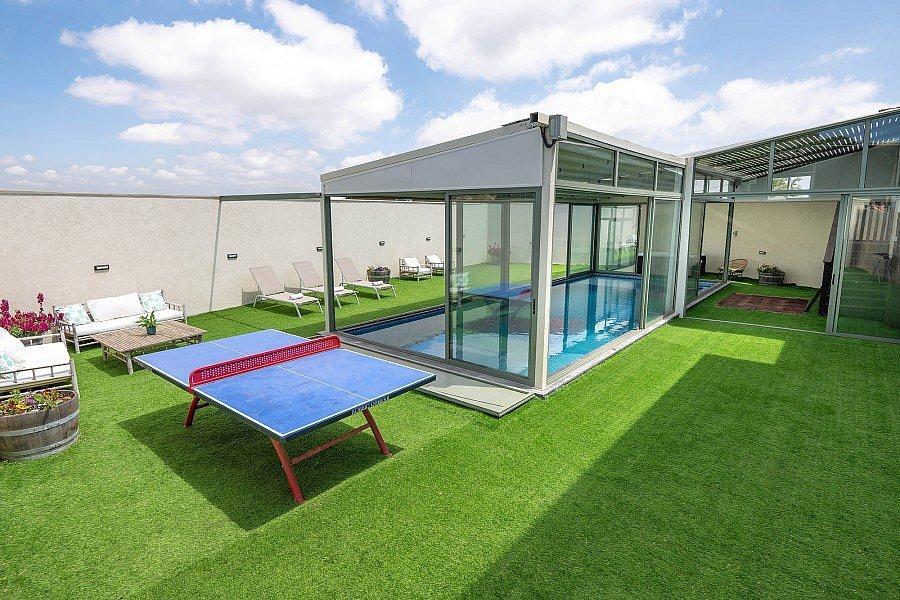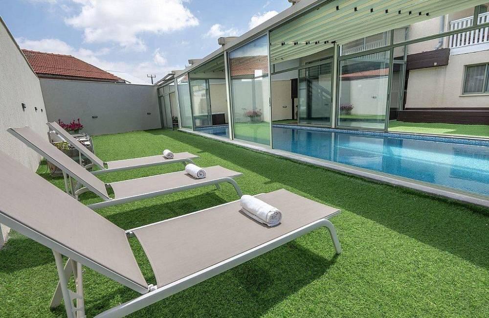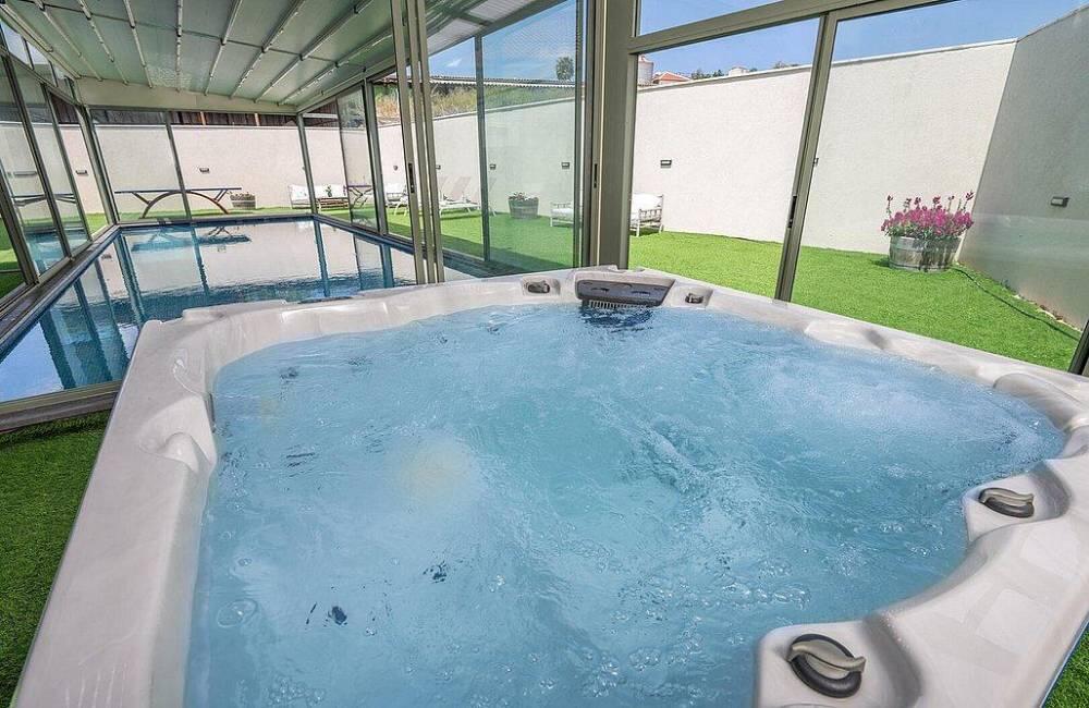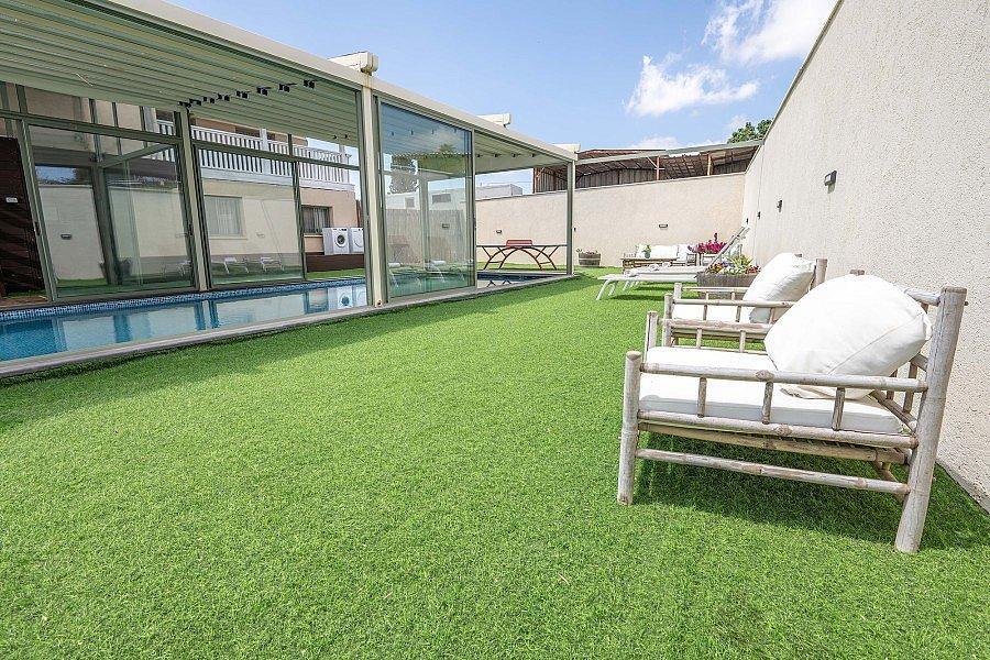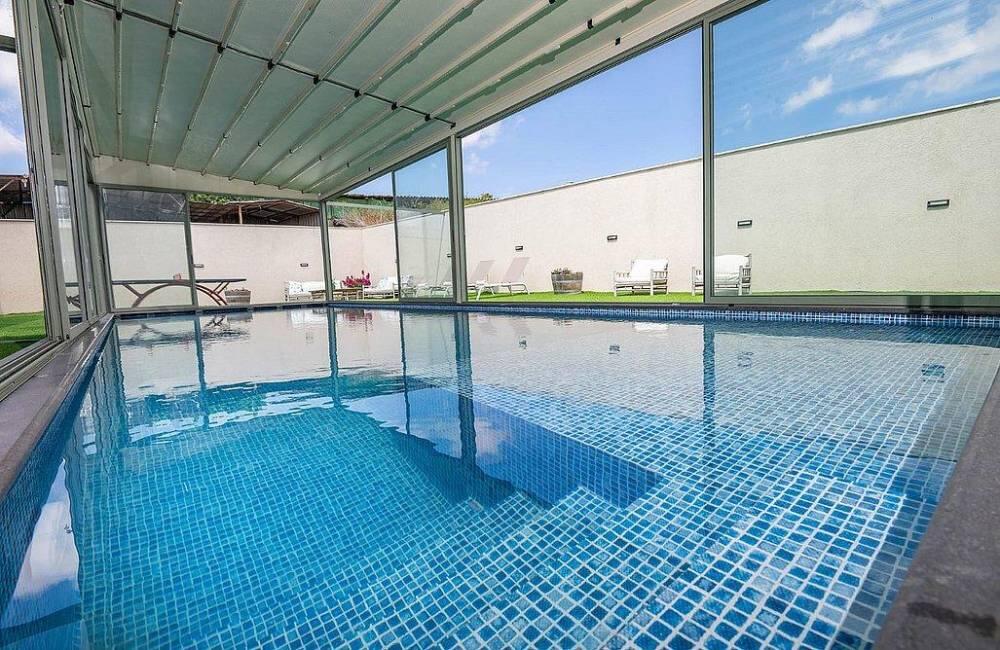 חצר ענקית עם בריכה פרטית מחוממת ומקורה, ג’קוזי ספא מפנק ומתחם מנגל מושלם לארוחות תחת כיפת השמיים.