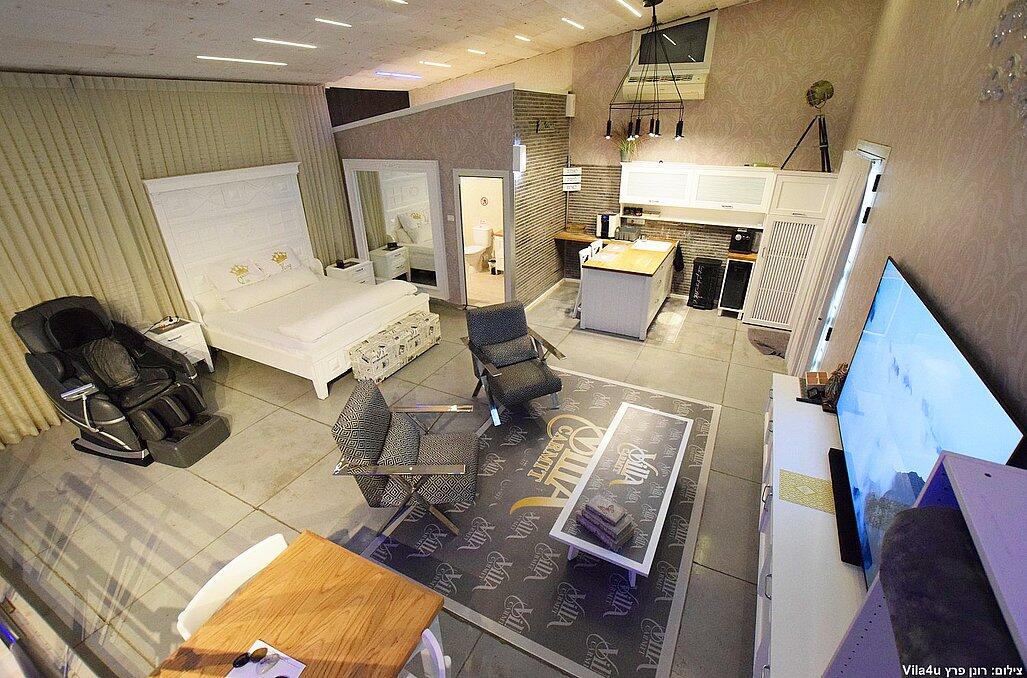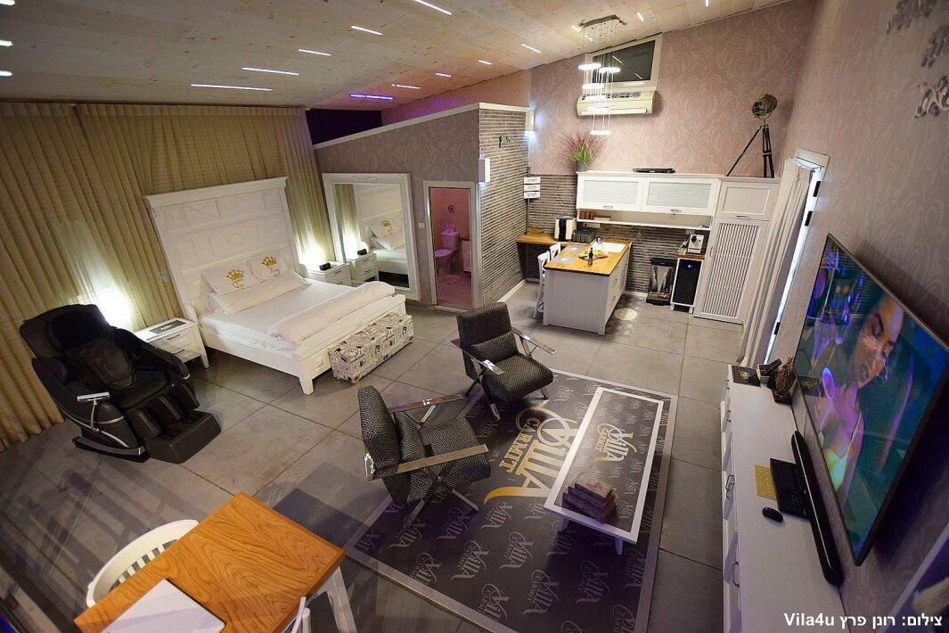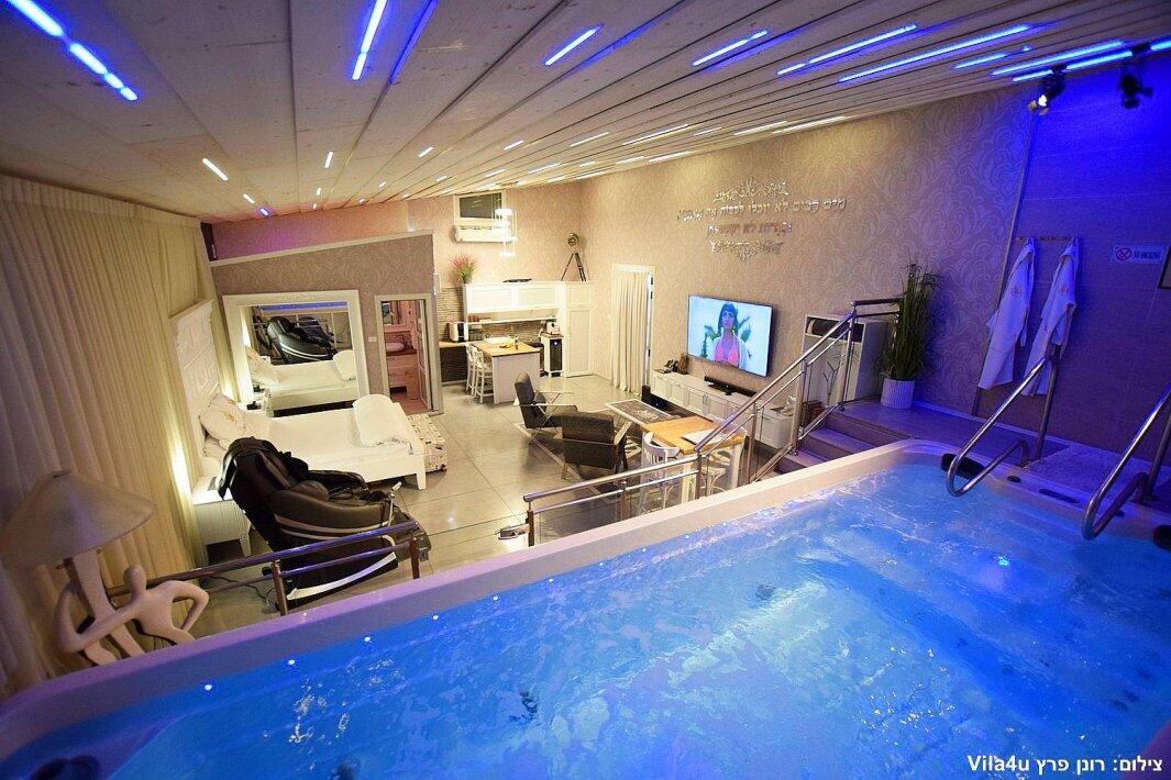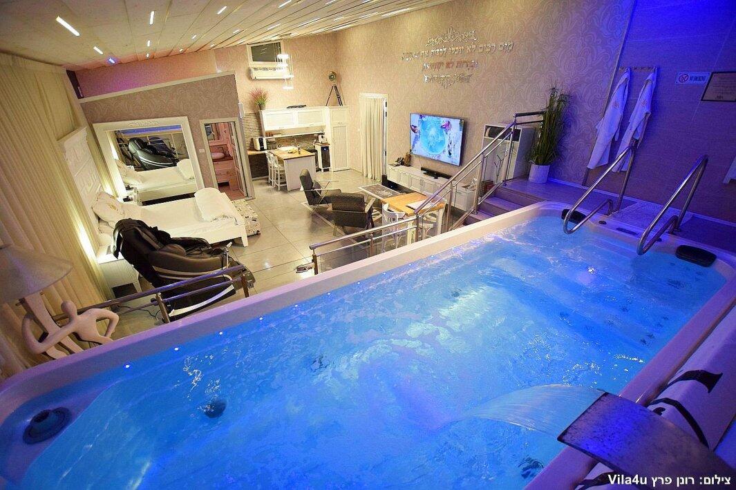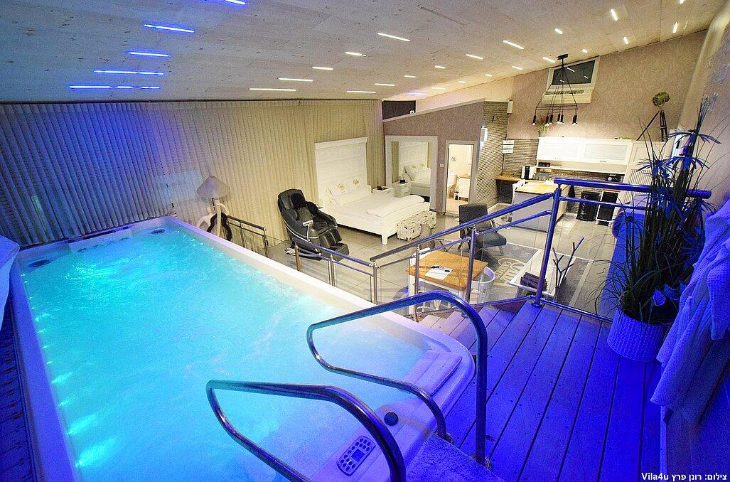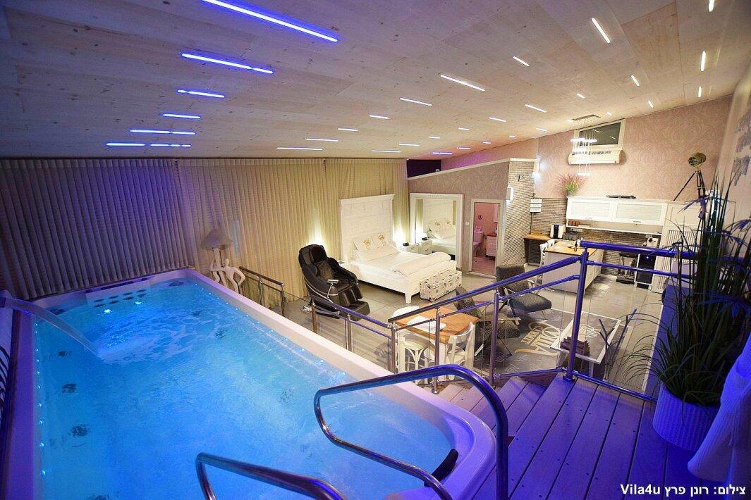 הסוויטה כוללת בריכת זרמים פרטית, מחוממת וענקית, מיטה זוגית נוחה, טלוויזיה 100 אינץ', חדר רחצה מפנק ומטבח מאובזר עם מכונת אספרסו.