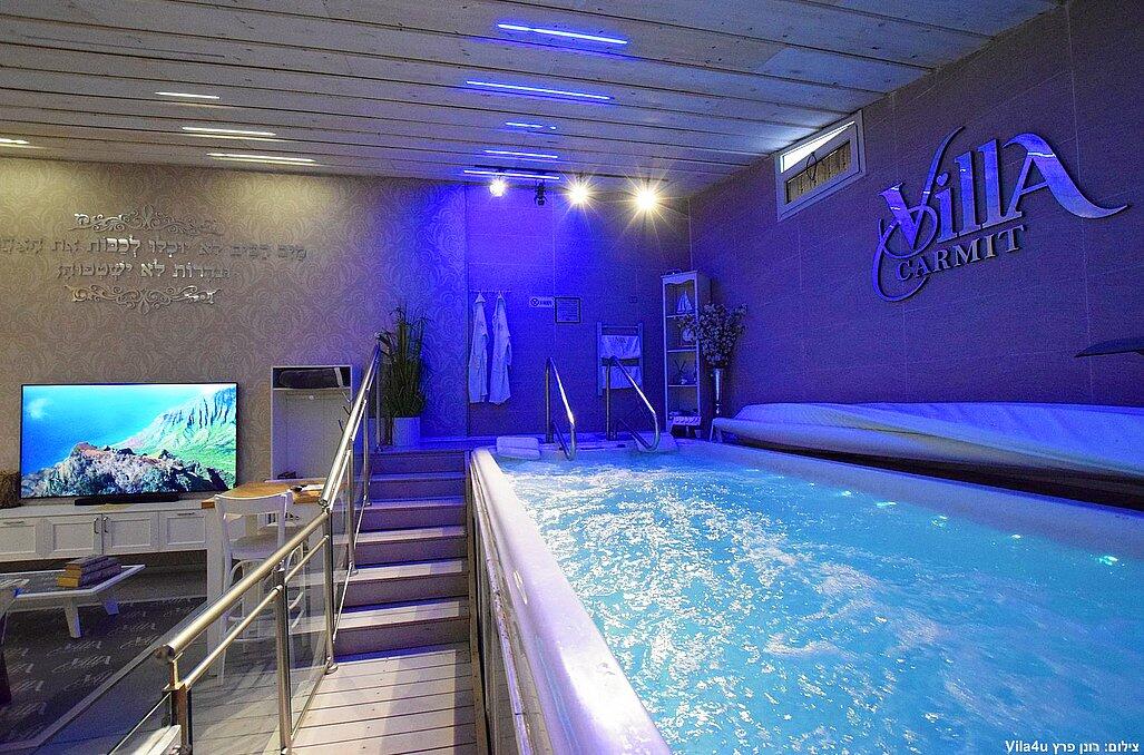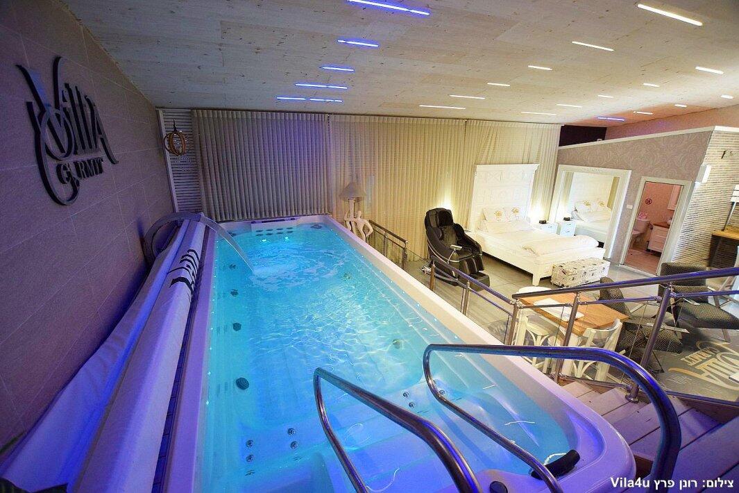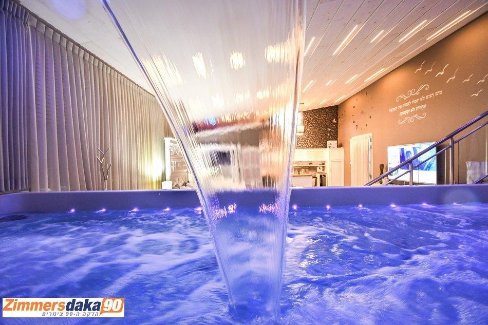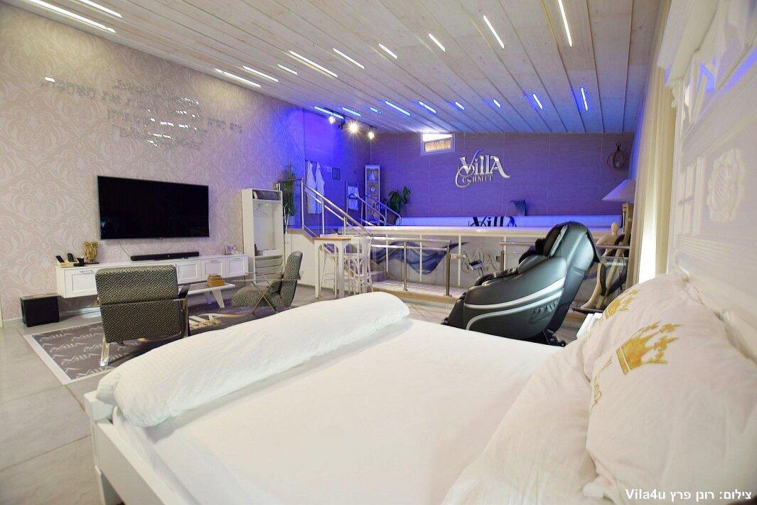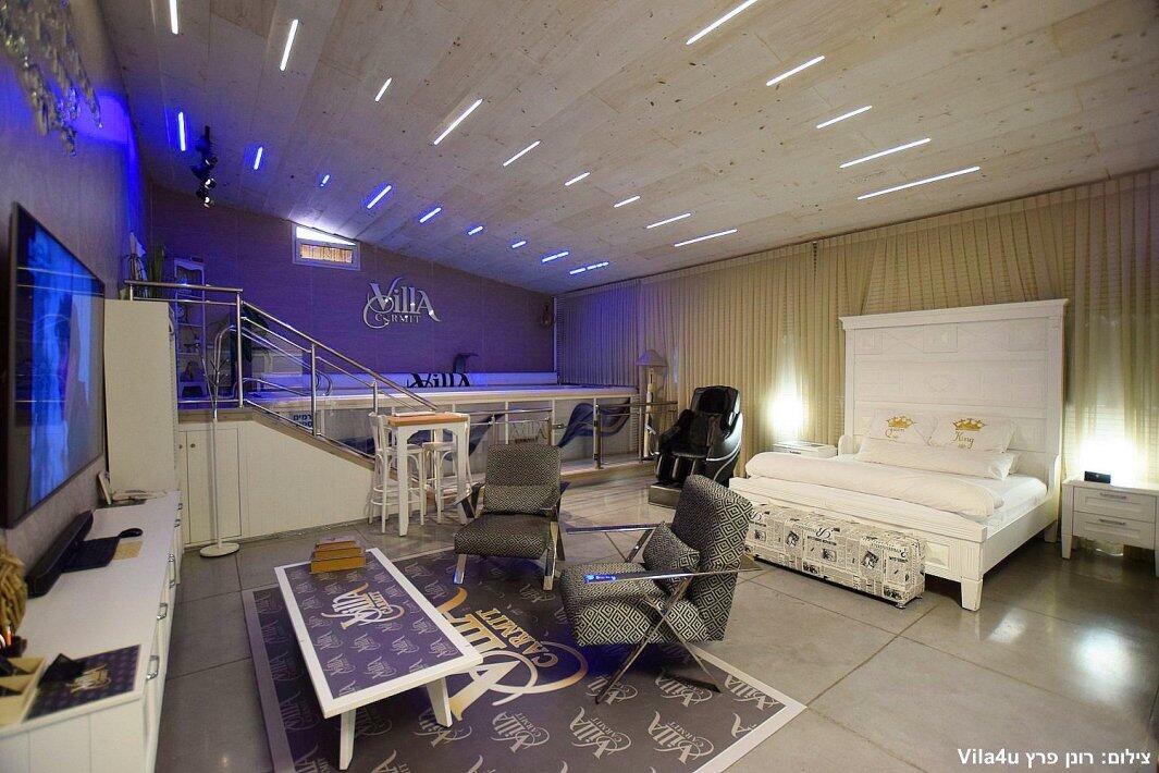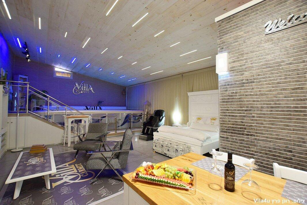 הסוויטה כוללת בריכת זרמים פרטית, מחוממת וענקית, מיטה זוגית נוחה, טלוויזיה 100 אינץ', חדר רחצה מפנק ומטבח מאובזר עם מכונת אספרסו.