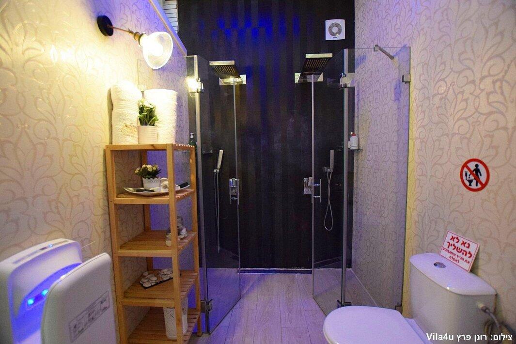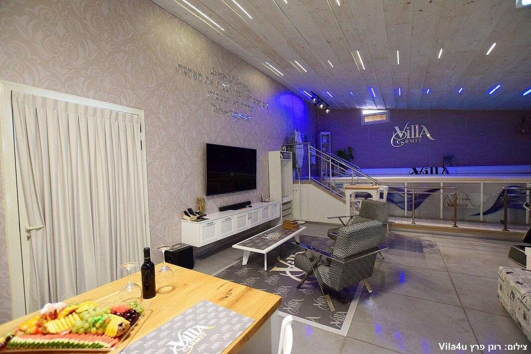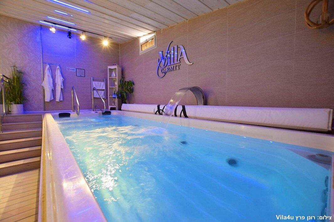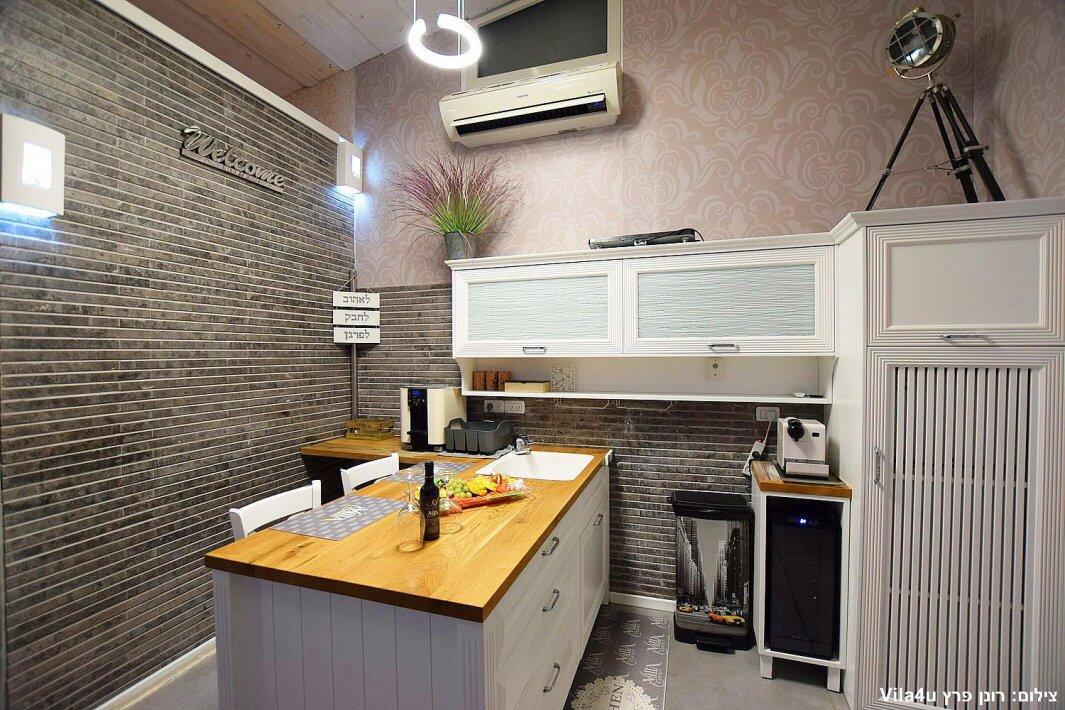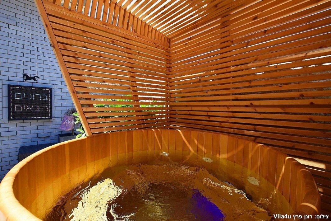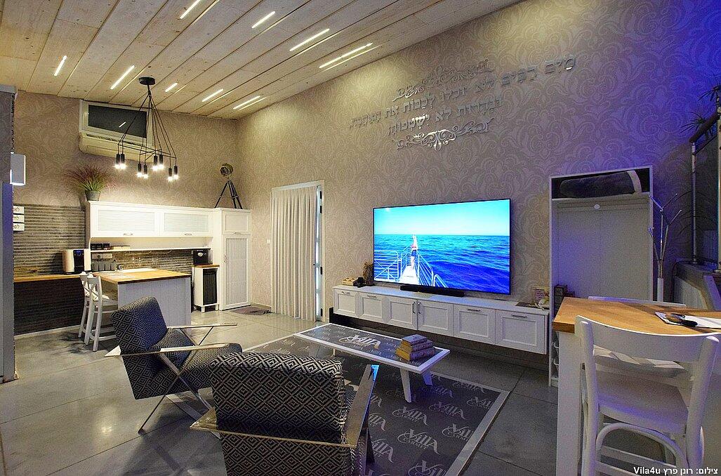 הסוויטה כוללת בריכת זרמים פרטית, מחוממת וענקית, מיטה זוגית נוחה, טלוויזיה 100 אינץ', חדר רחצה מפנק ומטבח מאובזר עם מכונת אספרסו.