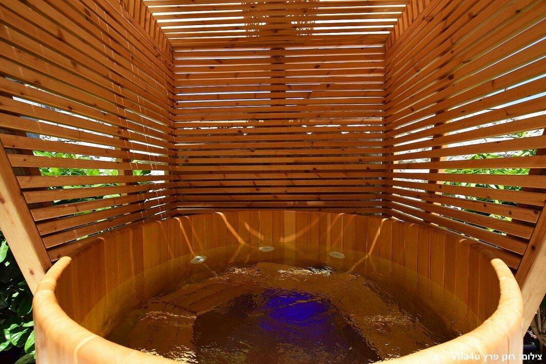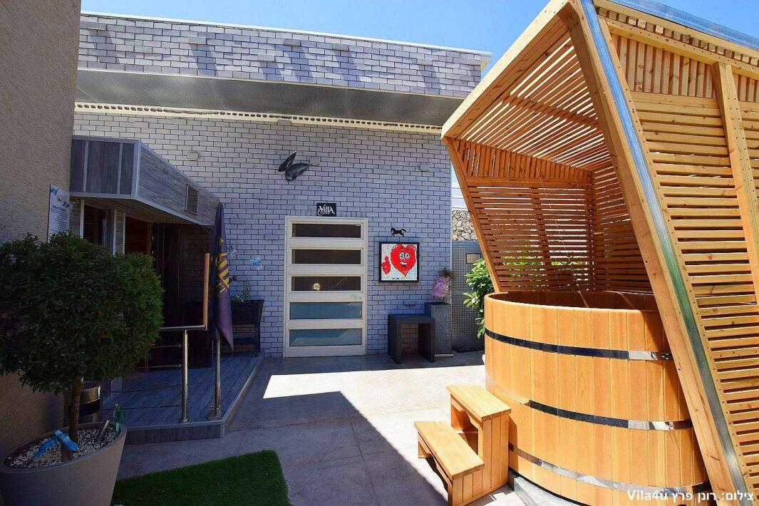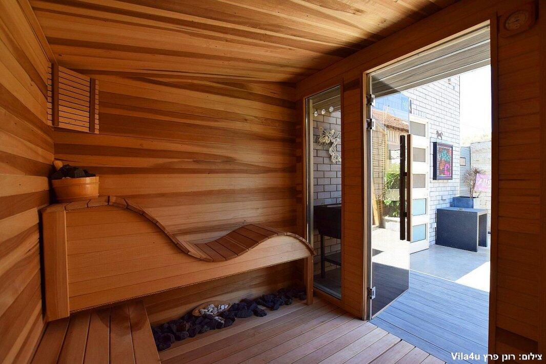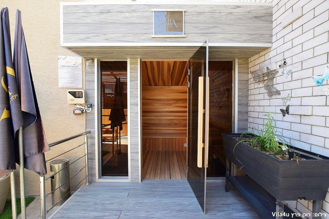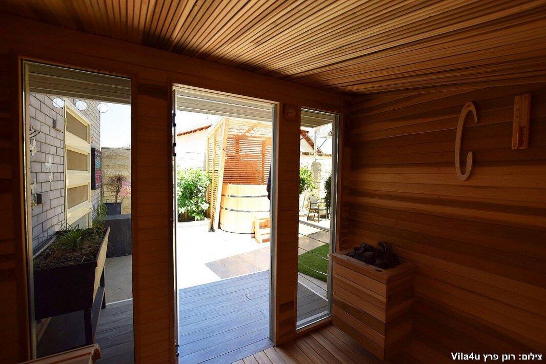 המתחם החיצוני כולל סאונה יבשה, פינת ברביקיו (ללא שבת), פינות ישיבה וריהוט גן יוקרתי.