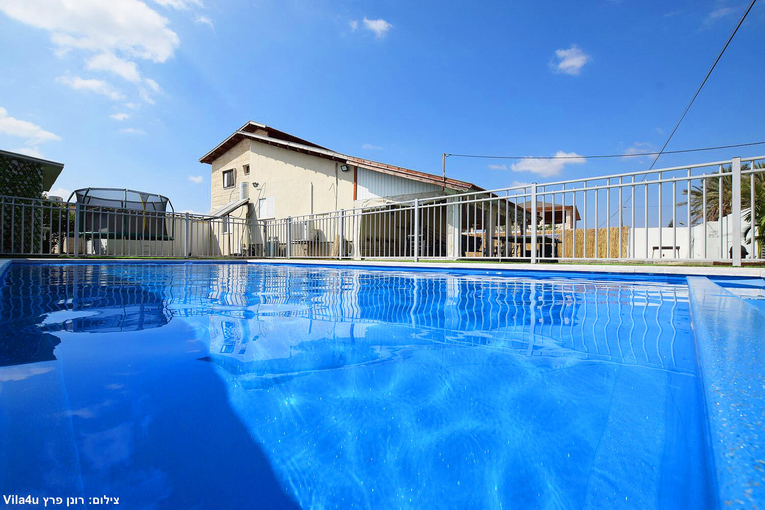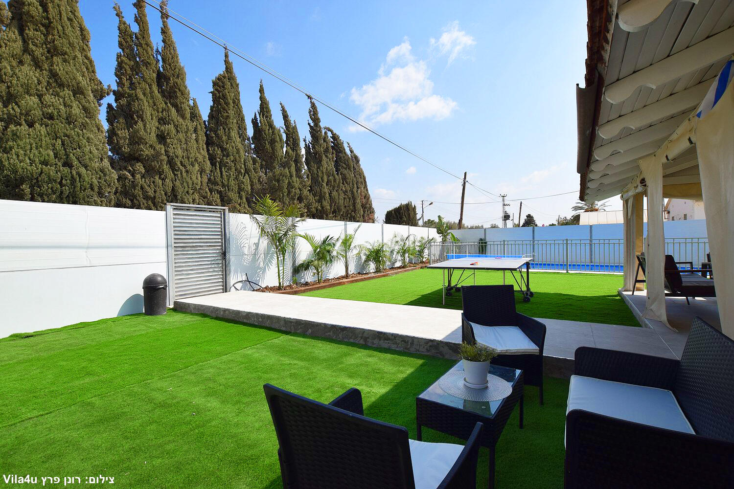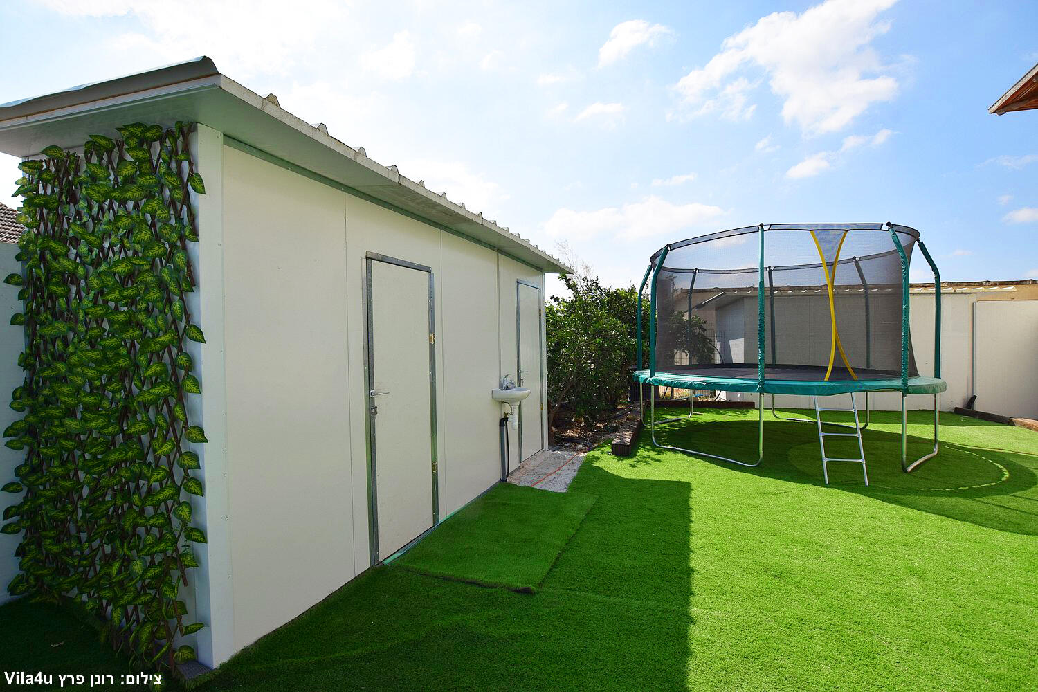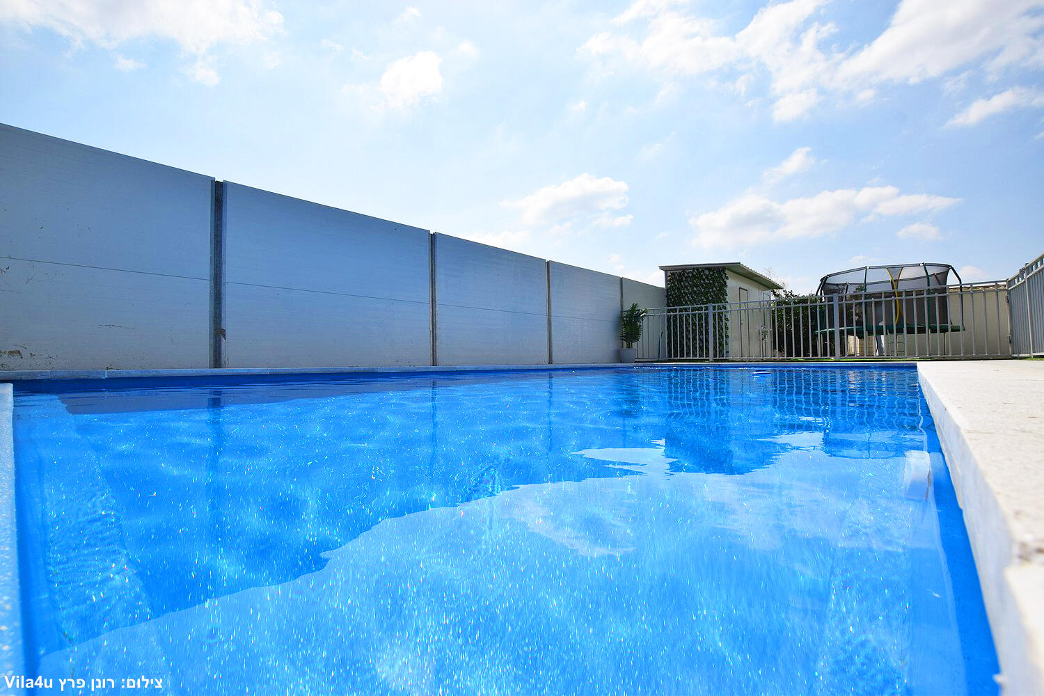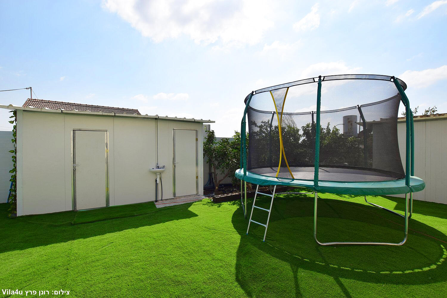 בחצר - בריכת שחייה ענקית, טרמפולינה לילדים, מדשאות מטופחות וריהוט גן.