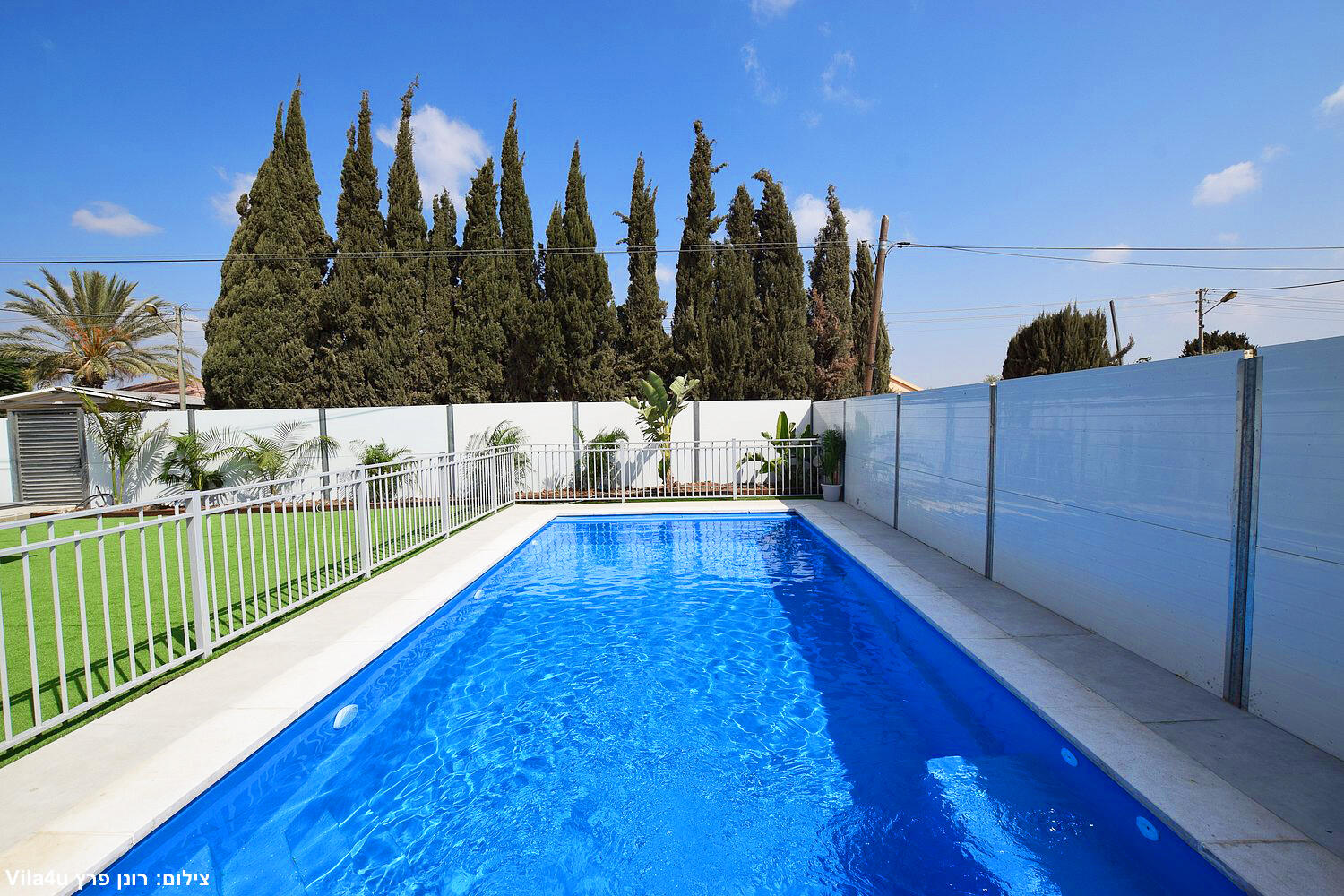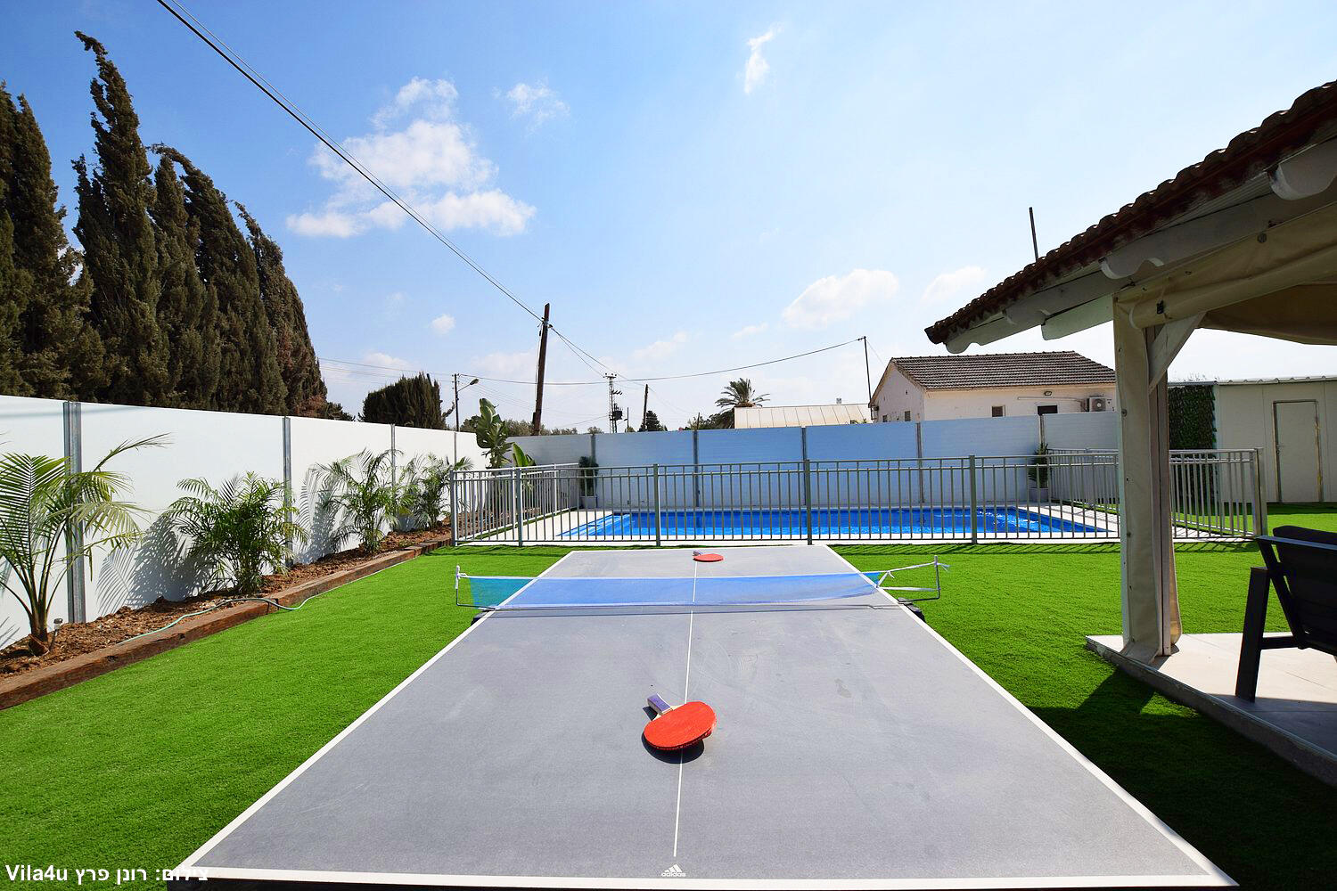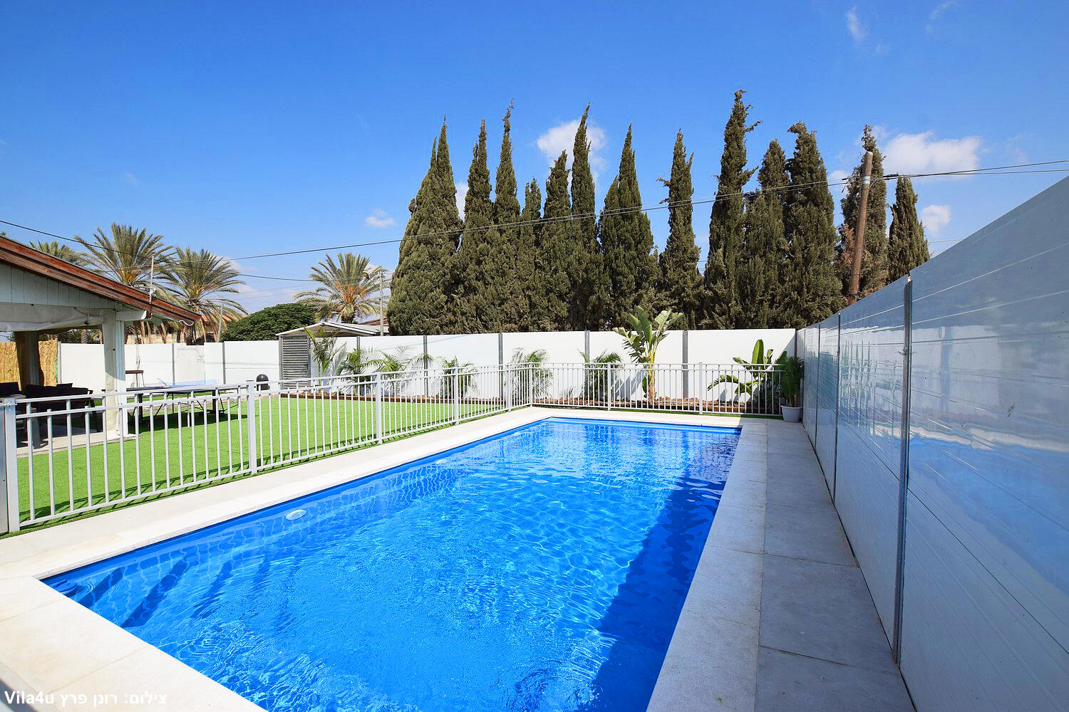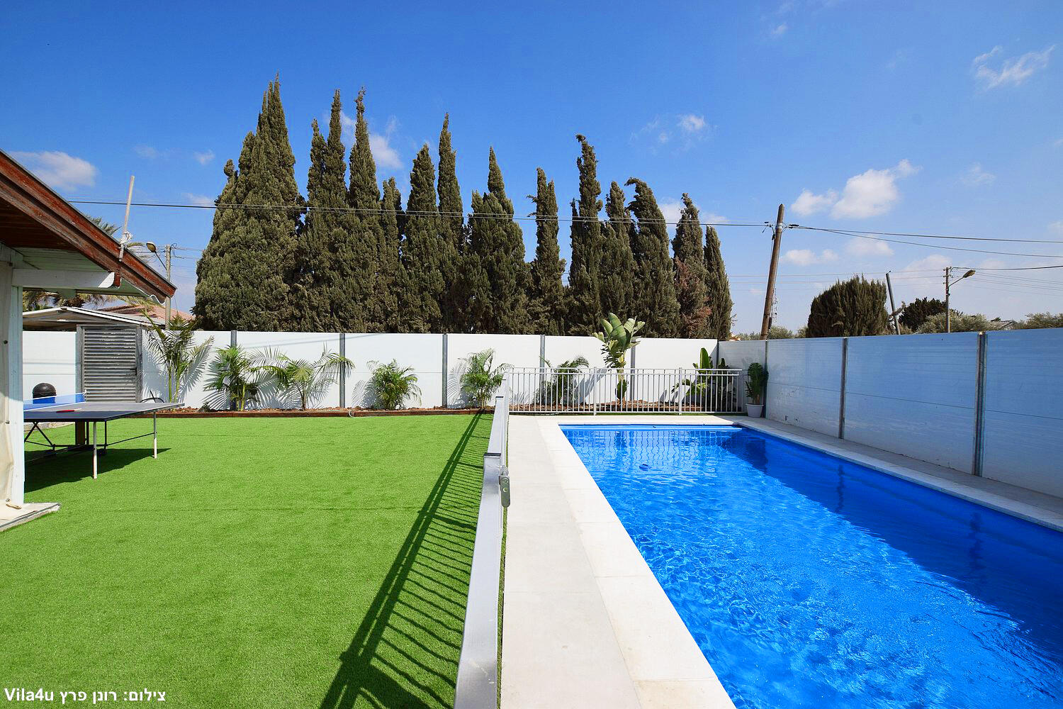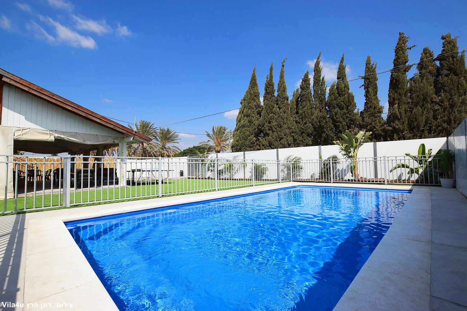בחצר - בריכת שחייה ענקית, טרמפולינה לילדים, מדשאות מטופחות וריהוט גן.