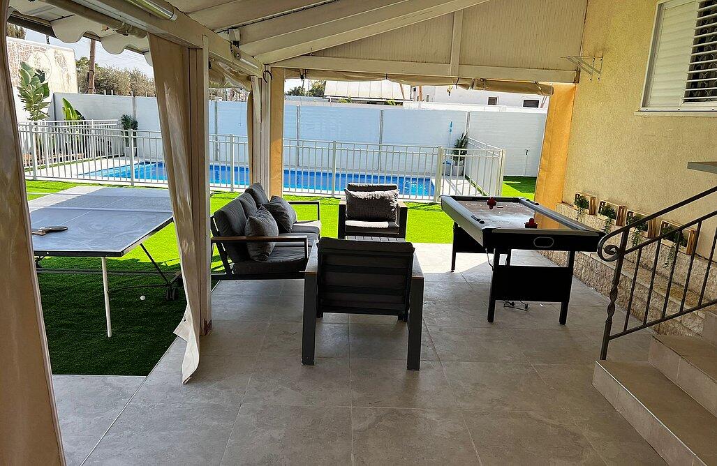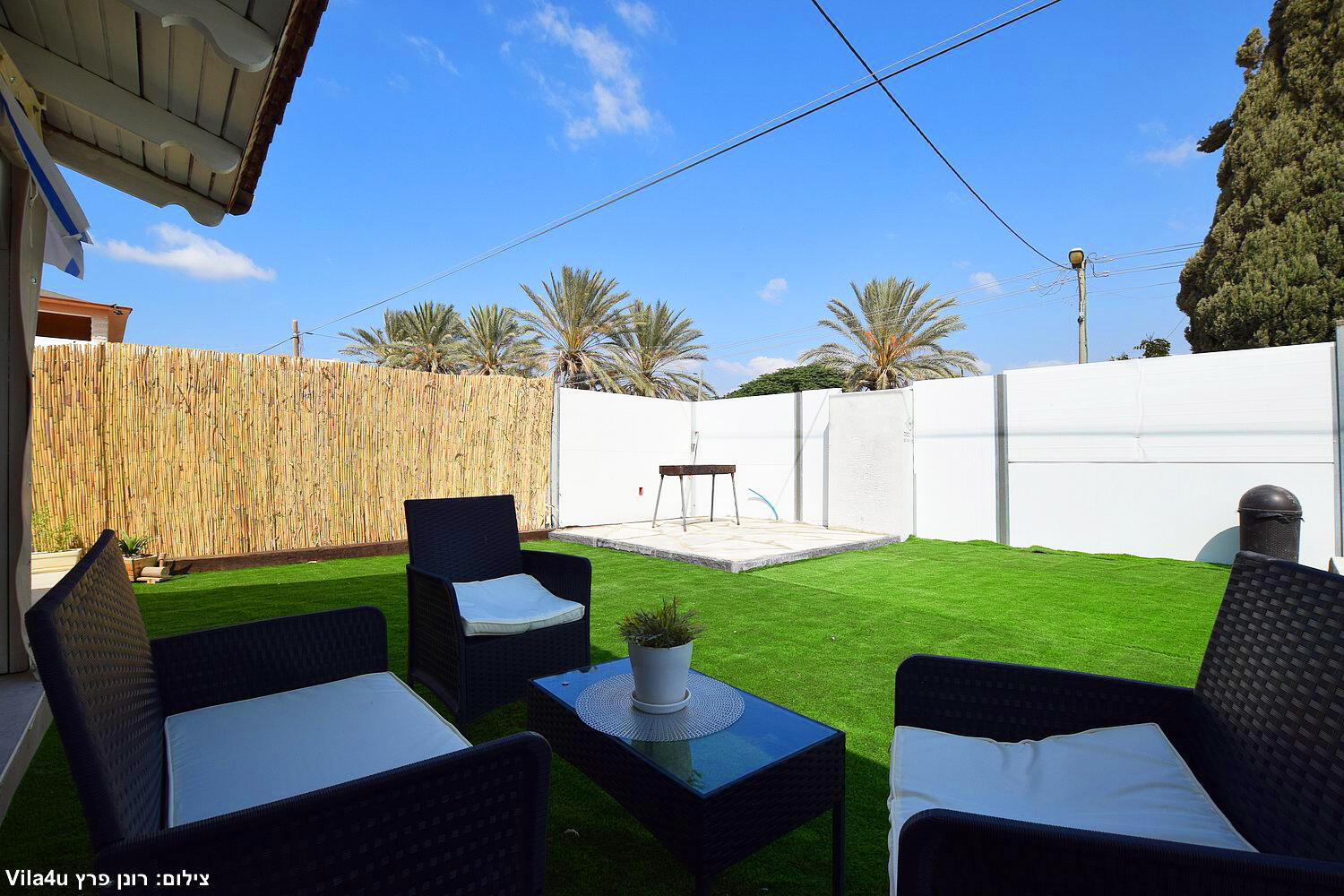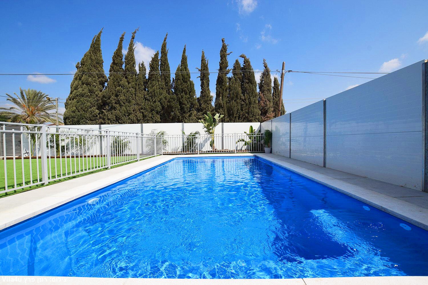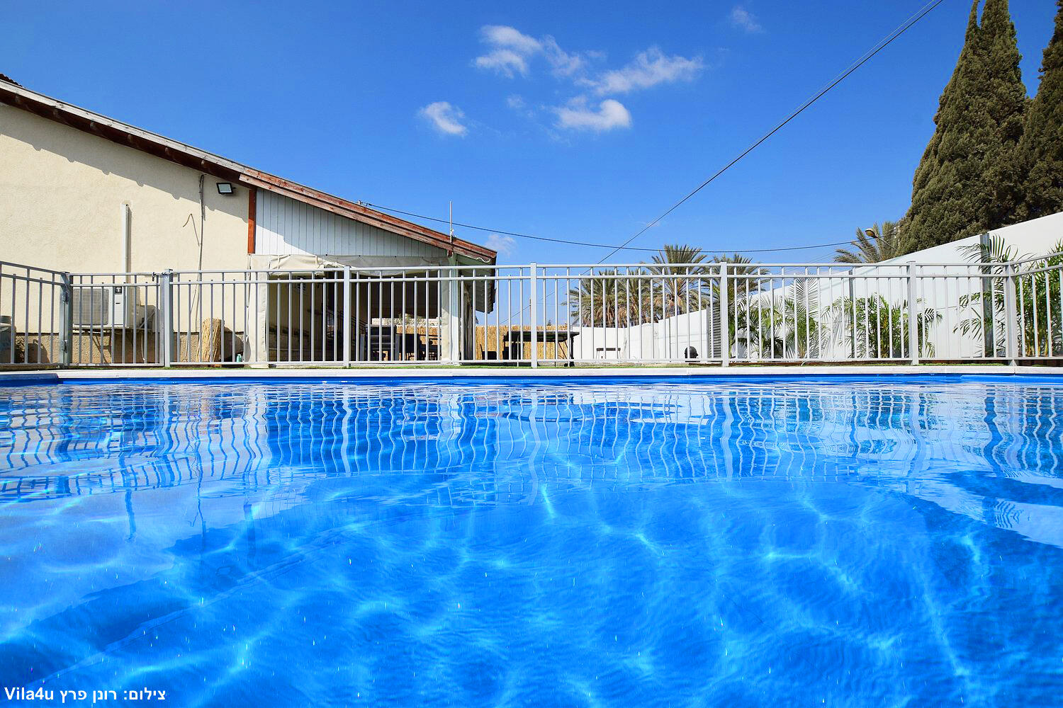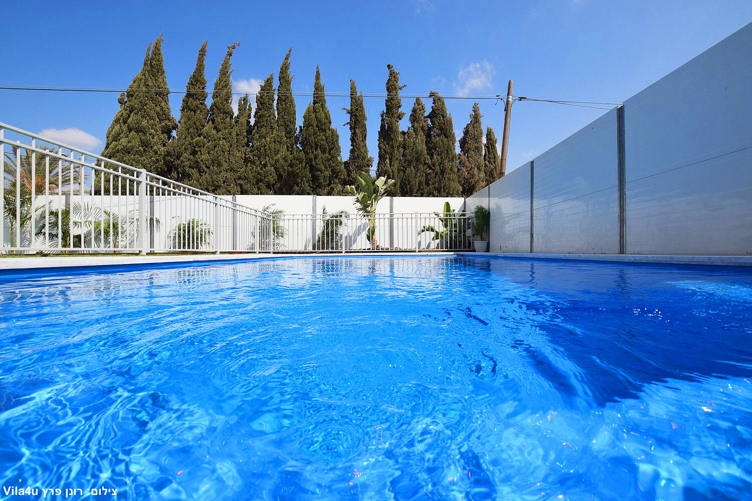 בחצר - בריכת שחייה ענקית, טרמפולינה לילדים, מדשאות מטופחות וריהוט גן.