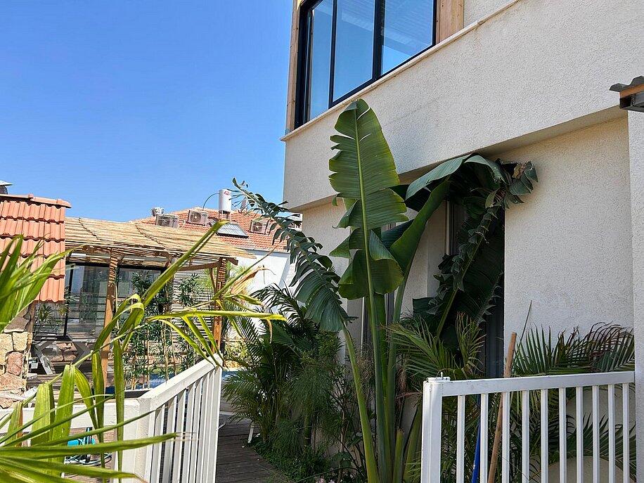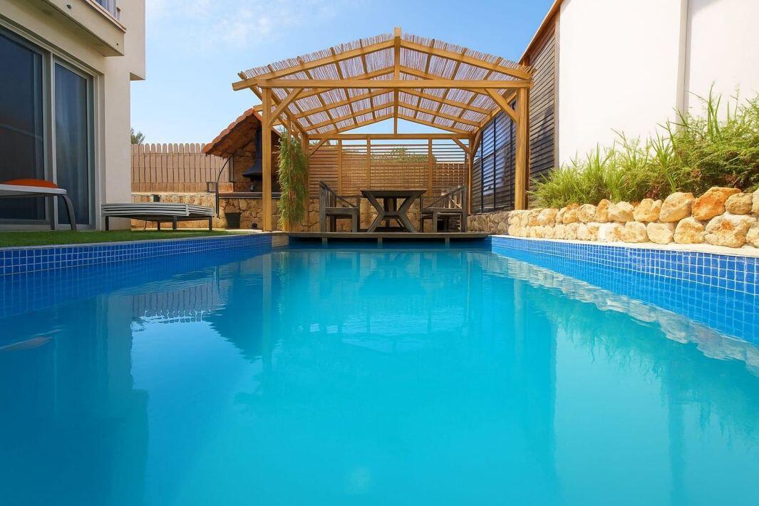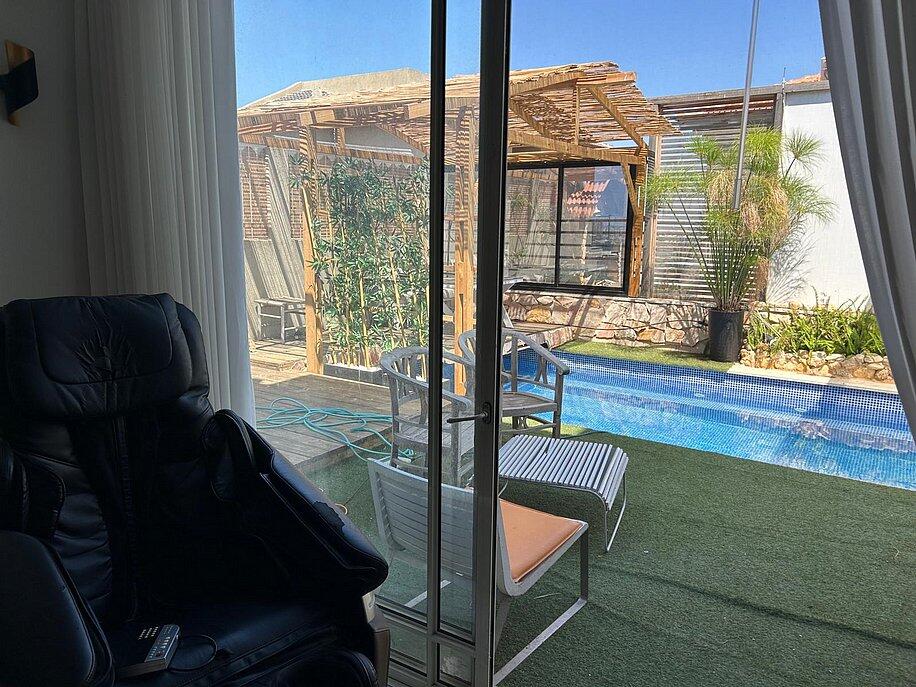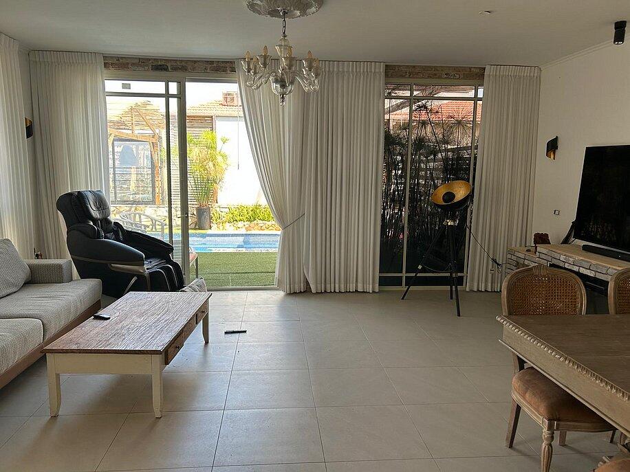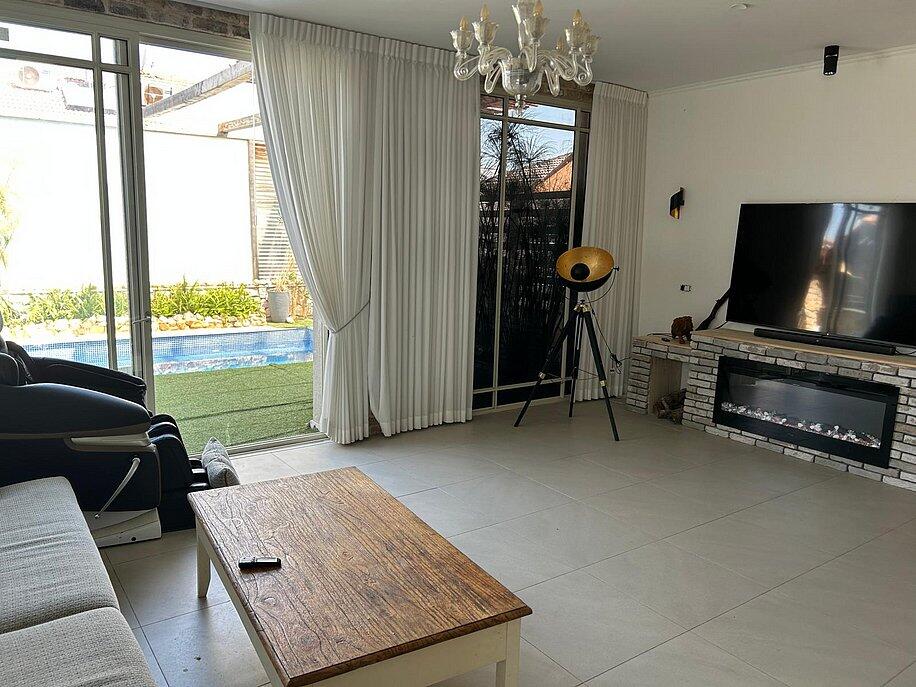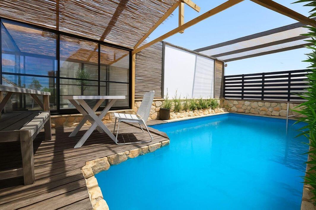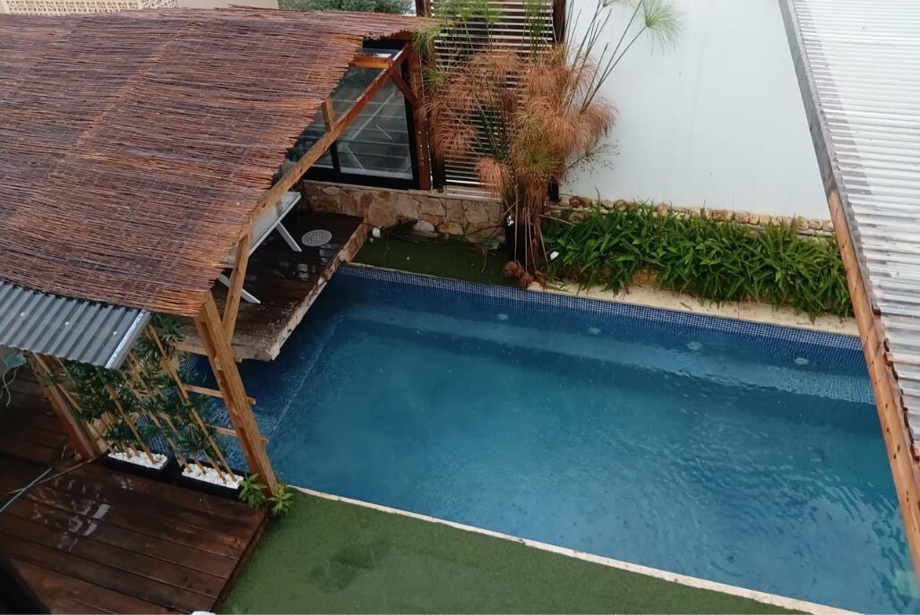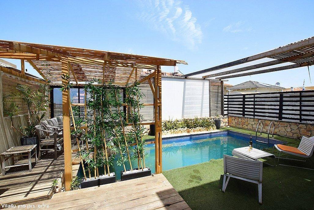 2 חדרי שינה, סלון מרווח ומטבח מאובזר מחכים לכם, בחוץ – בריכה פרטית, מדשאות ופינת ברביקיו.