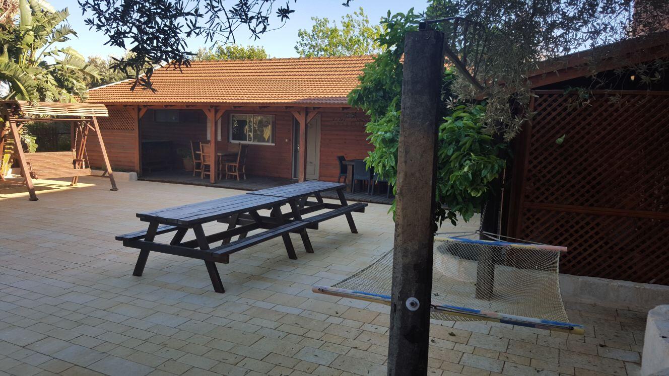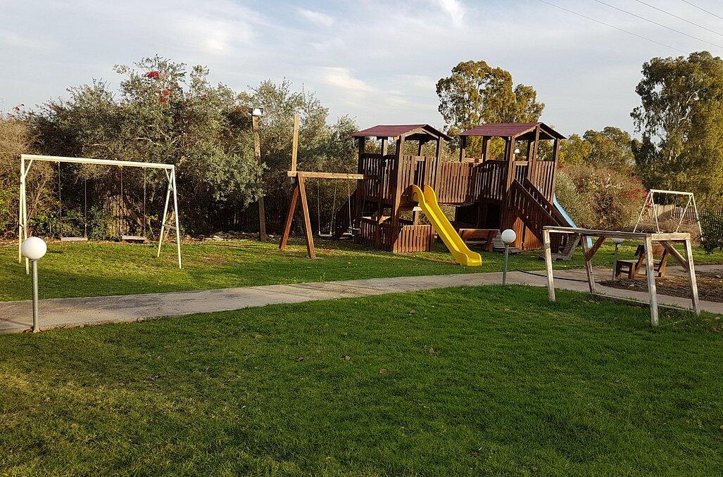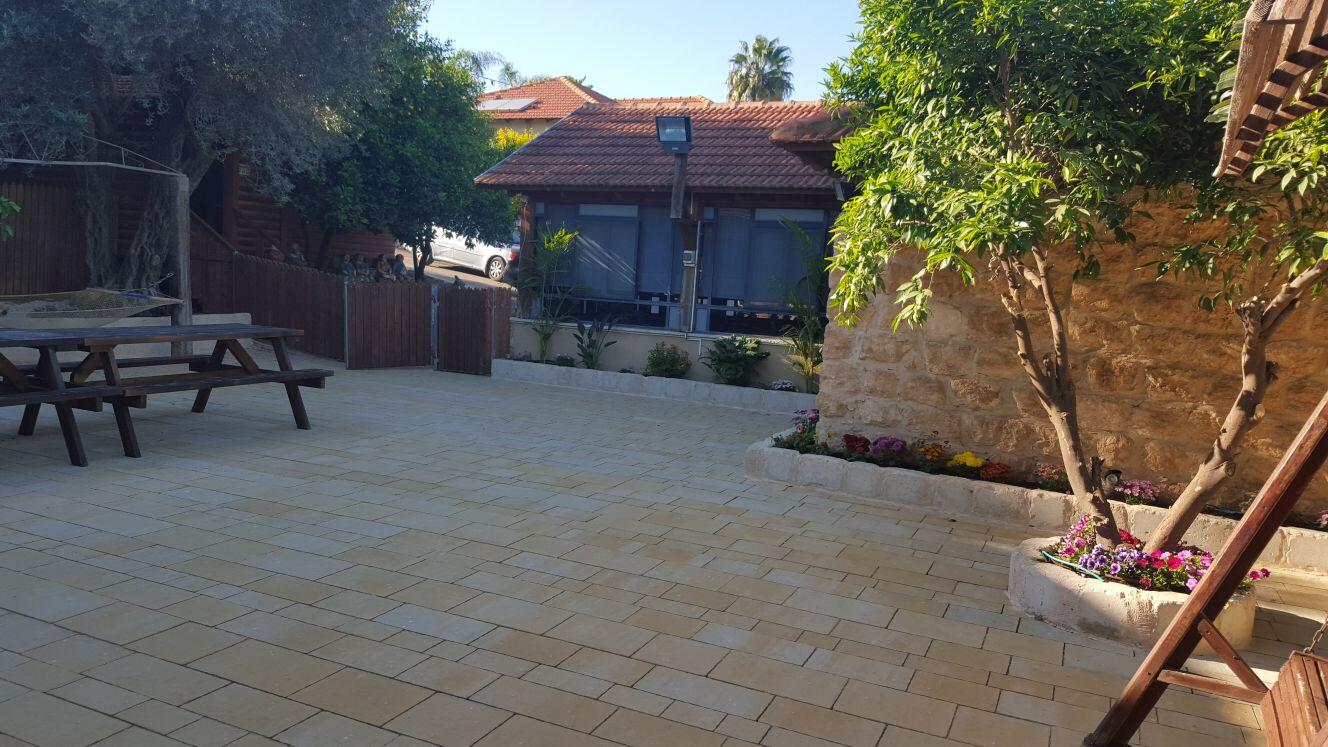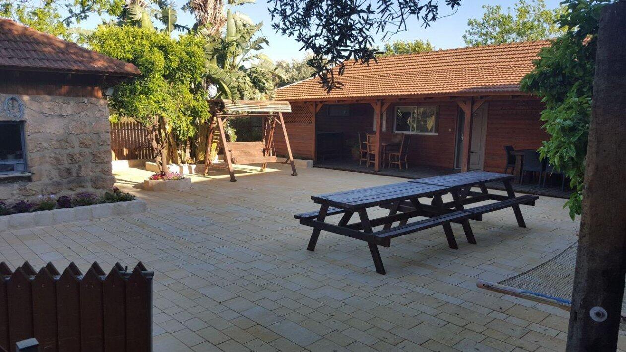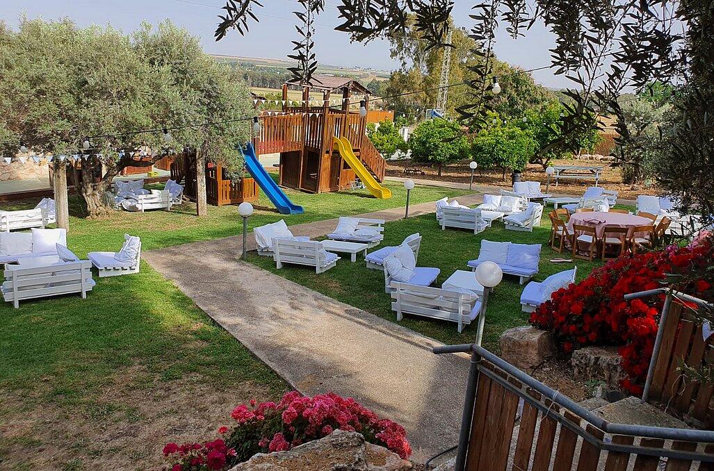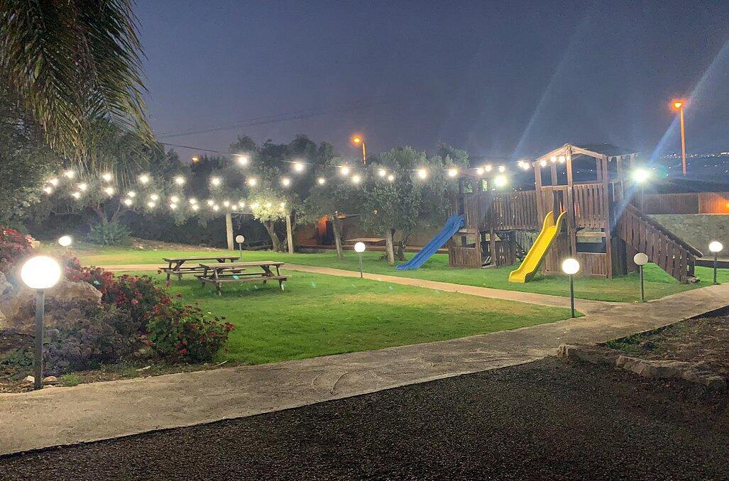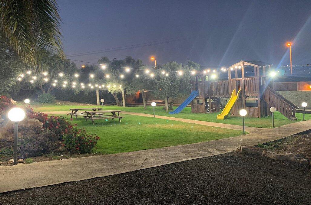 חצר המתחם מעוצבת במחשבה וטוב טעם עם תאורת אווירה , צמחיה מרהיבה, גן שעשועים לילדים ושולחנות משחק לכל הגילאים.