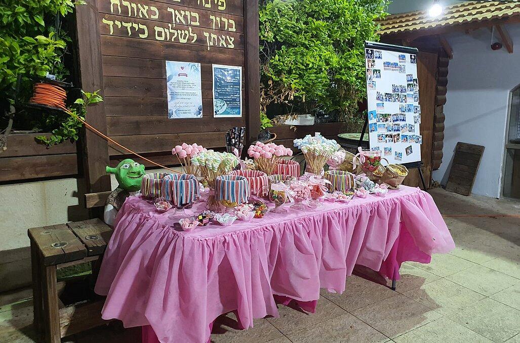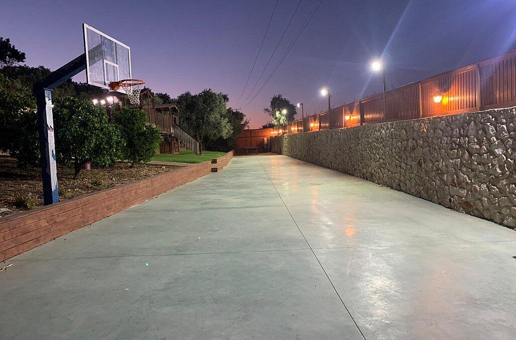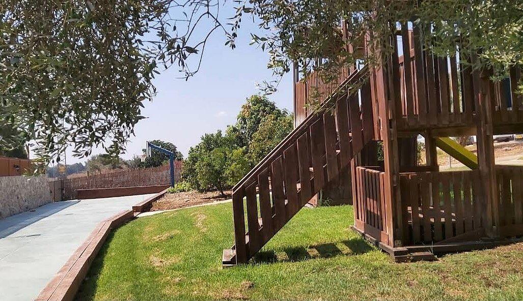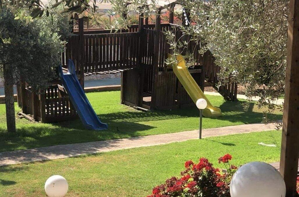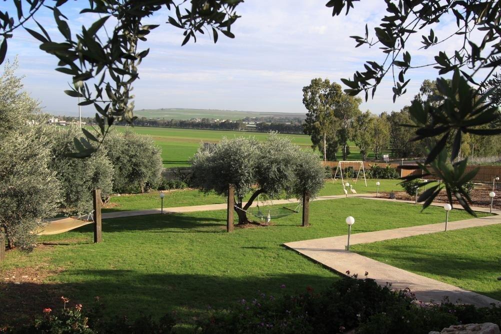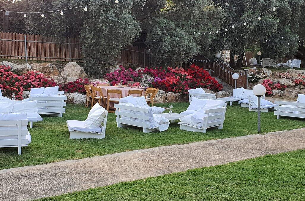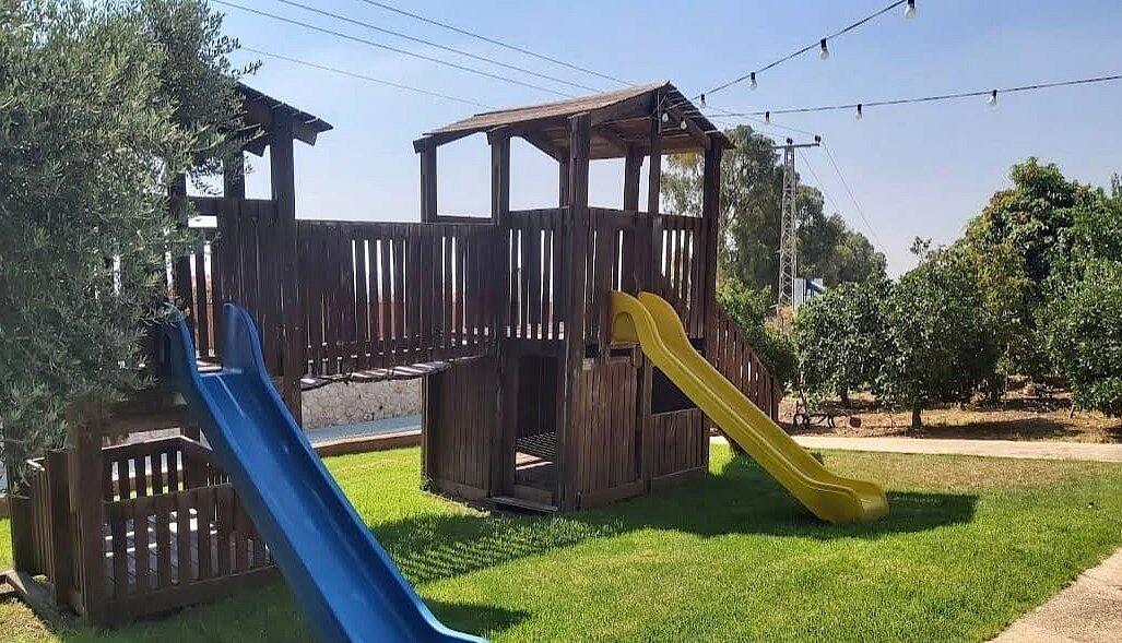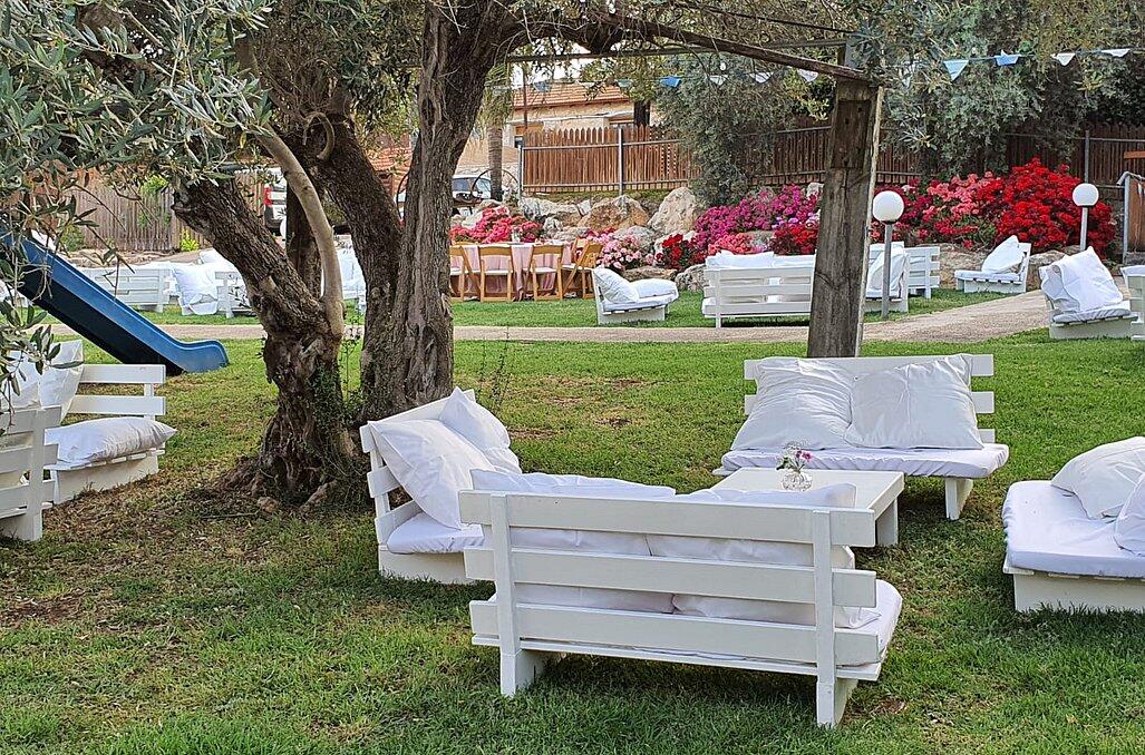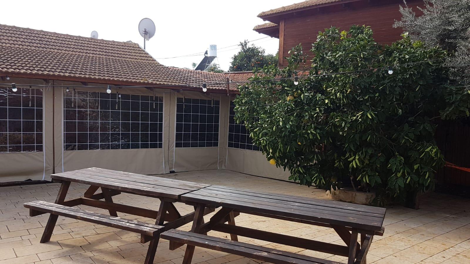 חצר המתחם מעוצבת במחשבה וטוב טעם עם תאורת אווירה , צמחיה מרהיבה, גן שעשועים לילדים ושולחנות משחק לכל הגילאים.