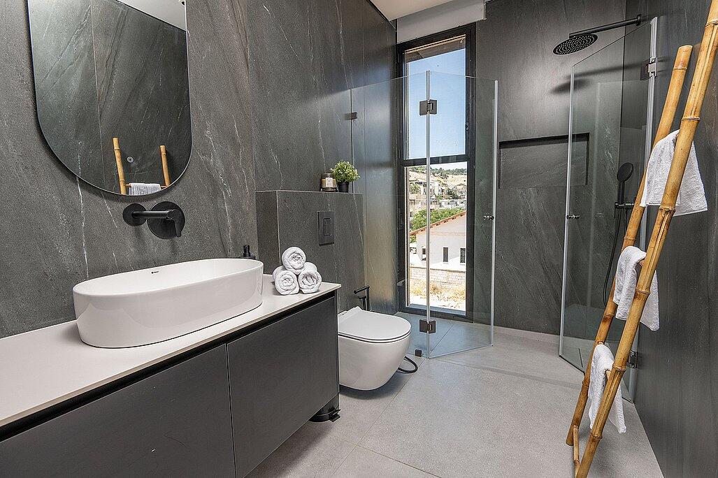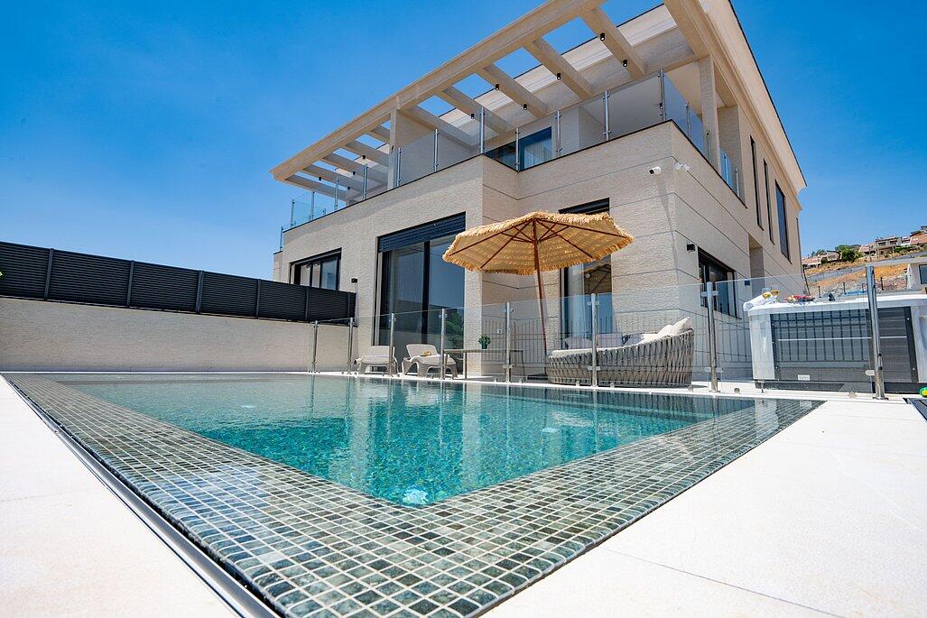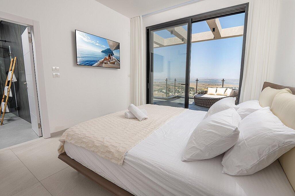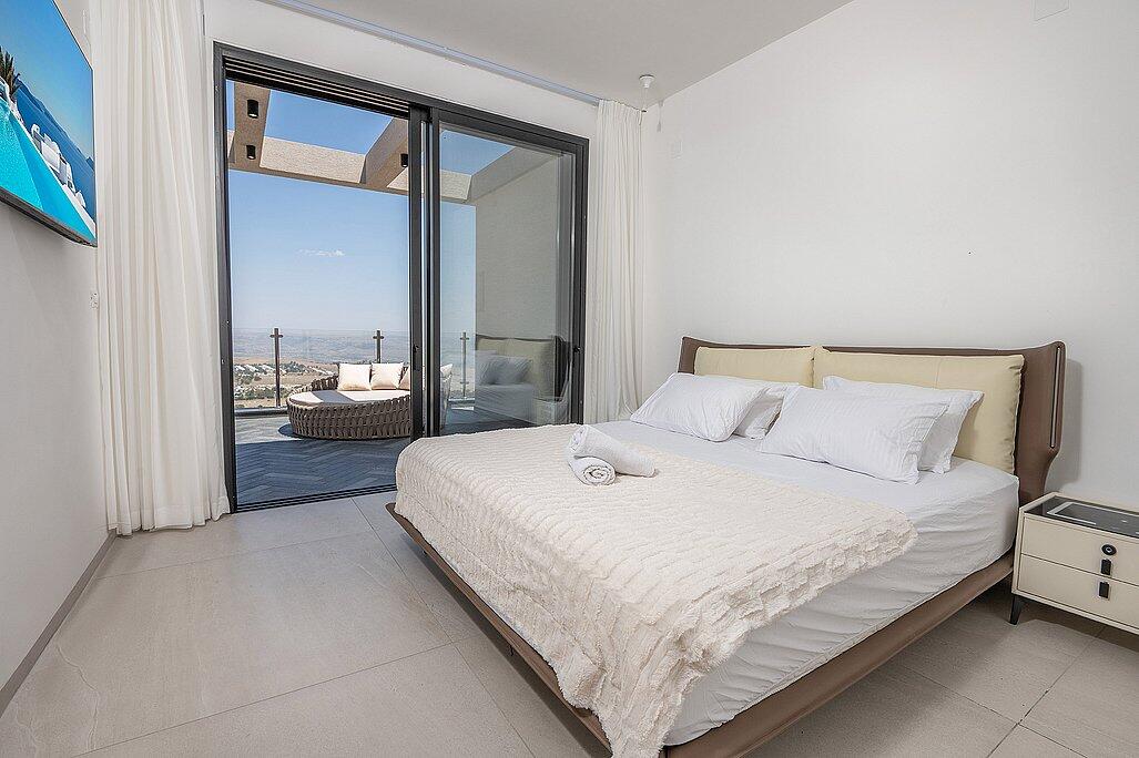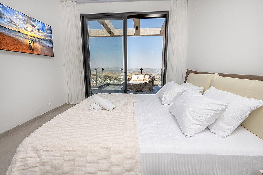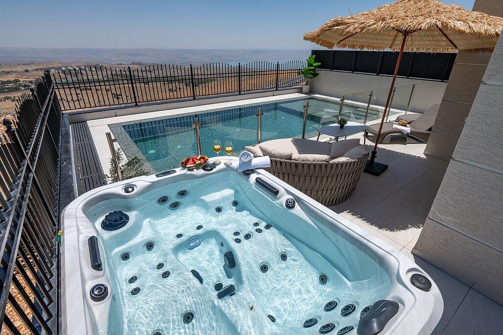 שלוש קומות של עיצוב מוקפד, מיטות מפנקות, בריכה מחוממת מול נוף פתוח, ותאורה רומנטית לערב.