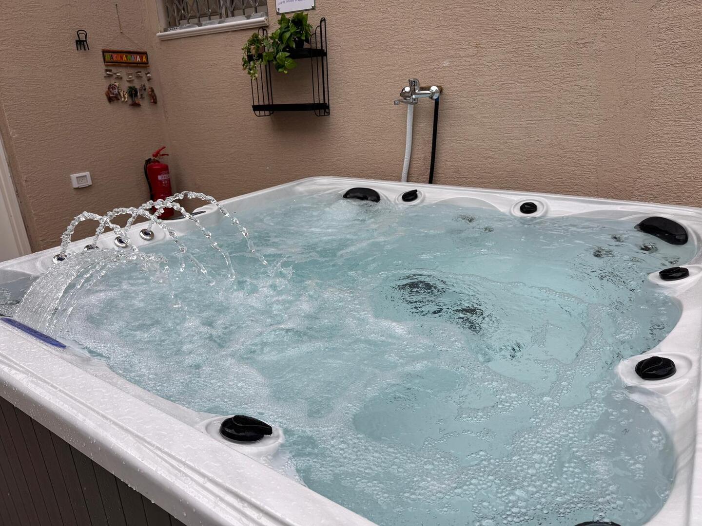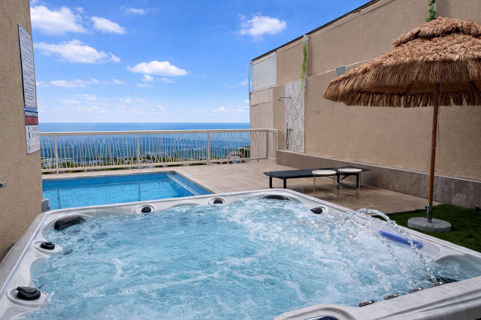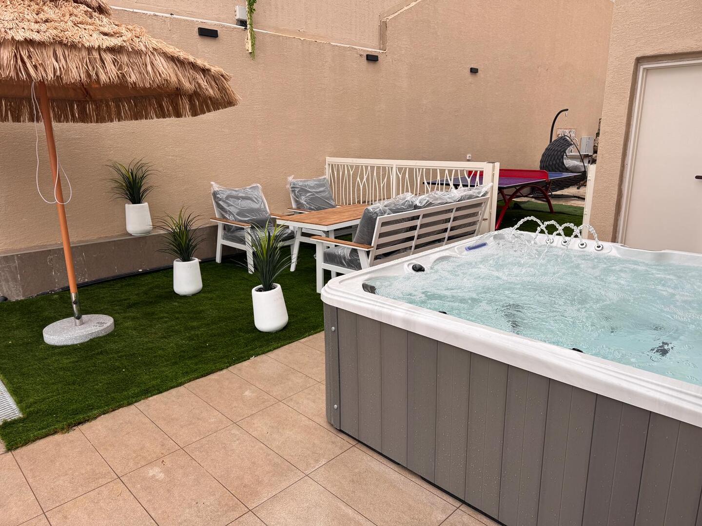 החצר המרווחת עם הבריכה המחוממת והג'קוזי יוצרת מתחם פרטי מושלם לרגעים של רוגע ופינוק.